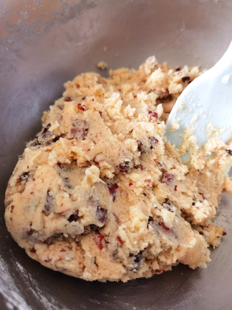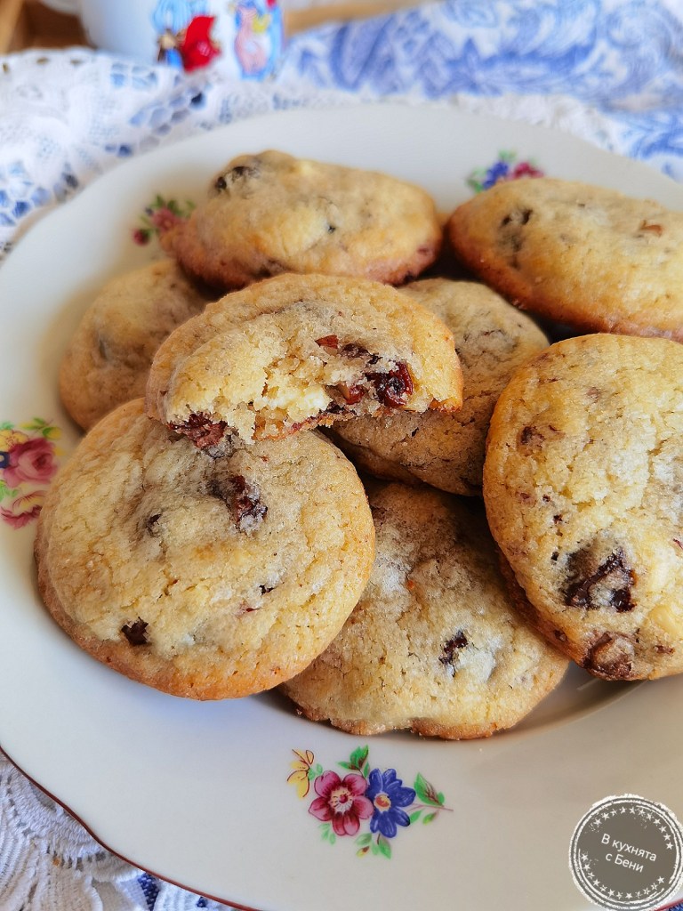 В купа сложих мекото масло, солта, ванилията и захарта и с миксер ги разбърках за 2 минути до пухкав крем. Добавих яйцето и разбърках до усвояването му от сместа. Брашното пресях с бакпулвера и постепенно добавих към сместа, като разбърквах с шпатула. На края прибавих сушените череши, пеканите и шоколада и разбърках финално.