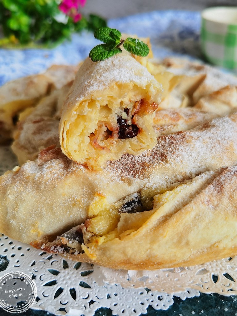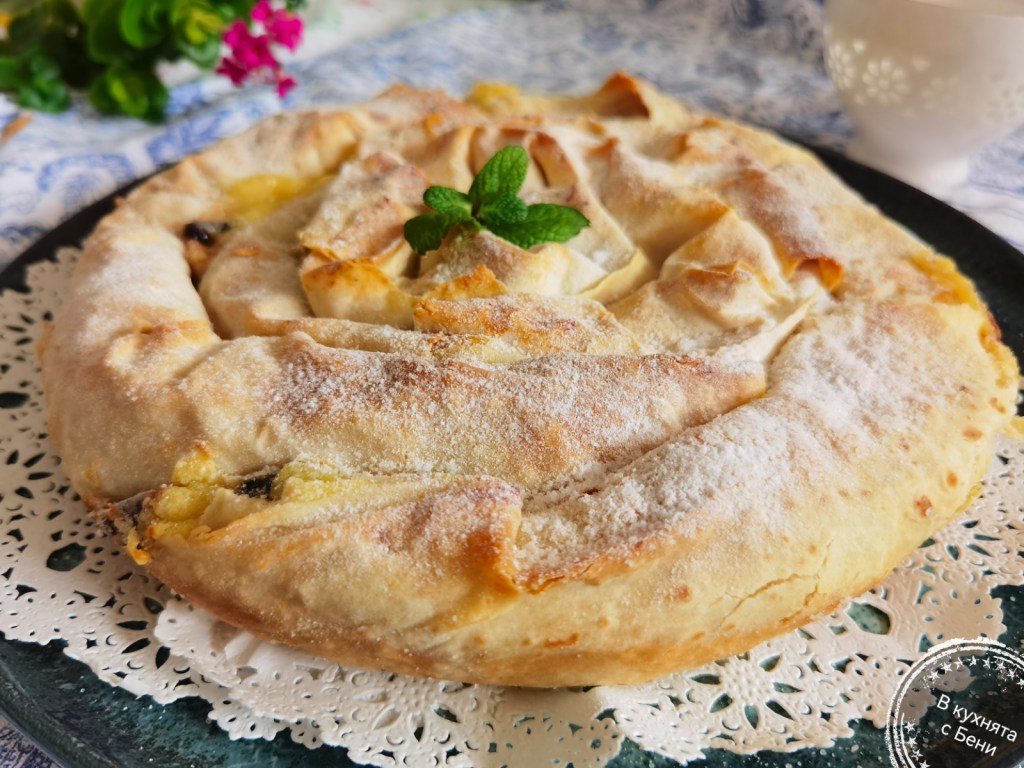 По този начин приготвих и останалите три кори. Отгоре намазах баницата с останалото масло и я сложих да се пече в загрята на 180 градуса за около 35 минути или до видима готовност и хубав загар. Оставих я да се поохлади за 20 минути, след което я поръсих с пудра захар и отрязах първите парчета. Може да се хапва и леко топла и студена.