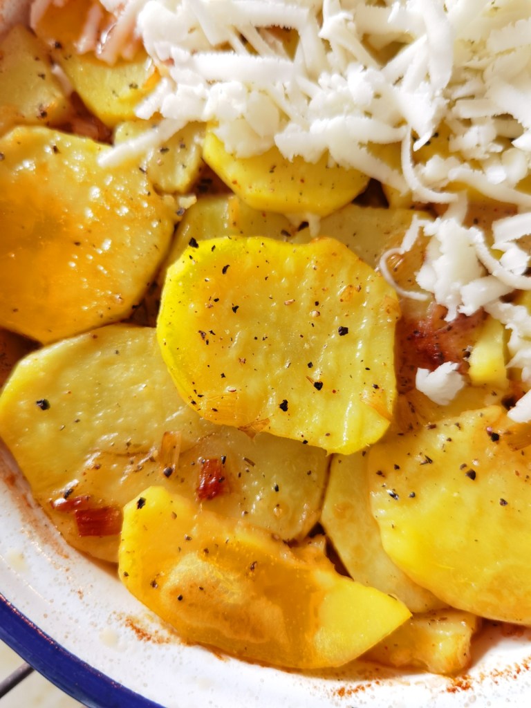 Имах няколко останали картофа и малко кисело зеле и ми хрумна да ги превърна в тази гозба за обяд. ☺️👩🍳🥔🍲😋Рецептата е пълна импровизация, но се получи изключително вкусно (според мен) и затова реших да я споделя с вас. 🤩Продуктите са малко като грамаж и стигат за не повече от 3 порции. Следващия път ще ги удвоя и ще приготвя ястието в по-голяма тава.☺️👌 Ако искате да е постно, не добавяйте кашкавала и маслото и пак ще е много вкусно. 🥔За успеха на ястието е важно картофите да са български, от онези, които не хващат око, но при готвене се топят в устата и придават чудесна консистенция на ястието. Аз използвах последните самоковски, които имах.☺️👩🍳