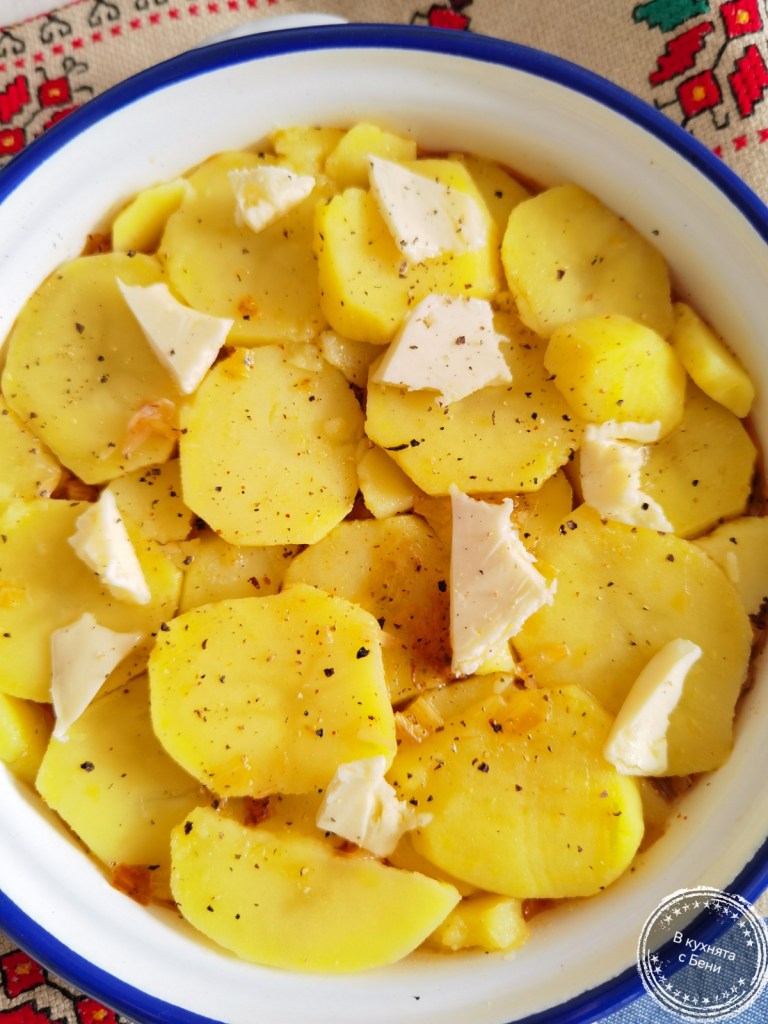 Тиганът „изплакнах“ с 100 мл. гореща вода и полях продуктите. На няколко места сложих парченца масло и сложих ястието да се пече в загрята на 190 градуса фурна за около 25 минути. След това поръсих с настъргания кашкавал и допекох до лек загар. Сервирах ястието топло, поръсено със ситно нарязан магданоз.