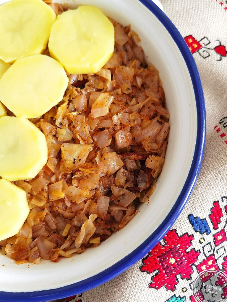 На дъното на малка тава с диаметър 20 см. и височина 5 см. разположих плътен слой от половината сварени картофени колелца. Отгоре разпределих зелето и завърших с останалите картофи.