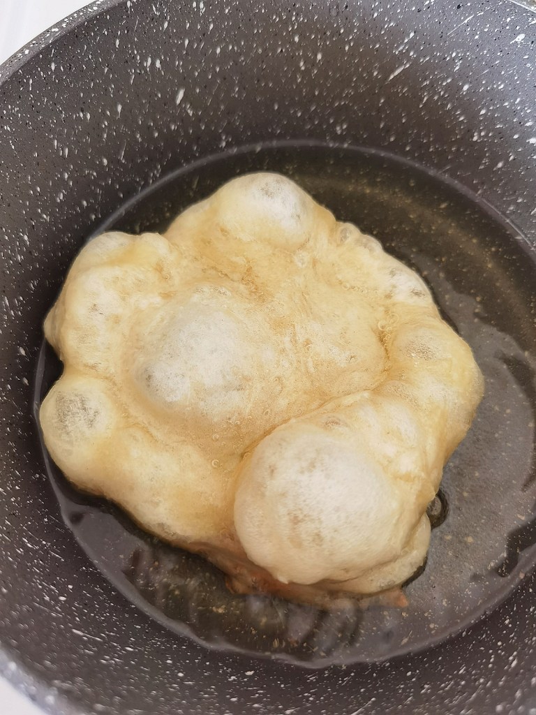 На сутринта извадих купата и отстраних фолиото. В малка чиния сложих малко олио. Малка тенджера напълних с 2-3 пръста олио и го загрях добре, след което намалих степента на 4 от 6 на моята печка. С намаслени ръце откъснах малко от тестото и го сложих в чинията, разстилайки го с пръсти до тънка мекица. Внимателно я сложих в горещата мазнина и пържих до апетитен загар от едната страна, след което я обърнах, за да се изпържи и от другата. Готовата мекица извадих в чиния и по този начин изпържих и останалите.