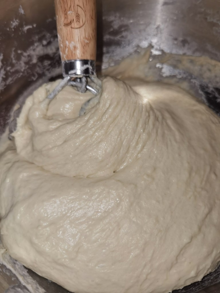 Брашното пресях и сложих в голяма купа. Добавих солта и маята и разбърках. Постепенно добавих водата и разбърках енергично до гладко, лепкаво тесто. Това отне около 3 минути. Възможно е да е нужна още 1 с.л. брашно, като нека ви води визията на тестото от първата снимка. Имам си нова бъркалка, която е много удобна и даже лесно замесва тестото, освен да разбърква продуктите. Купата с полученото лепкаво тесто покрих с фолио за свежо съхранение. Оставих я на стайна температура за 20-ина минути, след което го прибрах в хладилника за 12 часа.