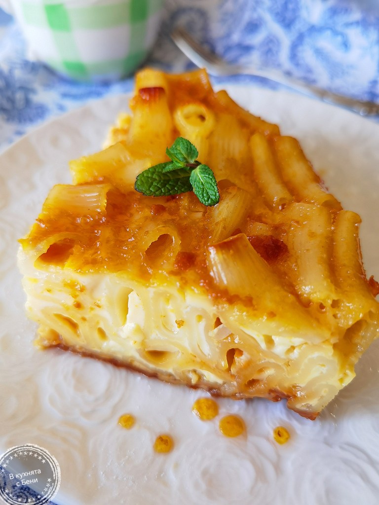 В тавичката, в която ще пека десерта сложих захарта и водата и на средна степен на котлона ги разтопих до златист карамел. Оставих го леко да се стегне и изсипах макароните и яйчената смес. Сложих да се пекат в загрята на 180 градуса фурна до видима готовност и апетитен загар. Това отне около 40 минути.