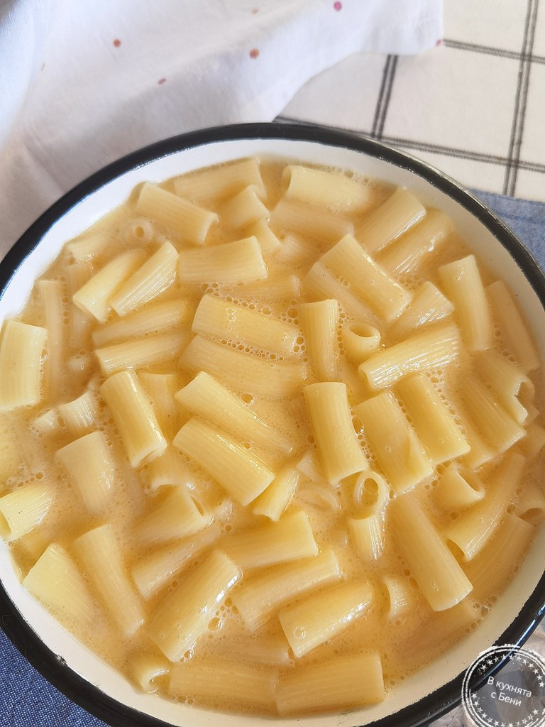 В малък съд сложих млякото и захарта и ги загрях съвсем леко, колкото захарта да се разтопи. Не трябва да бъде горещо! След това прибавих яйцата и ванилията и разбърках добре. С тази смес полях макароните и ги разбърках.