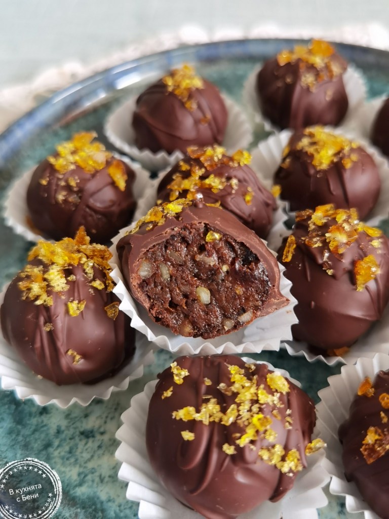 Малко плато покрих с хартия за печене. С лъжичка взех по малко от сместа и с ръце оформих бонбони, които разположих в платото. Сместа е лесна за работа. Получиха се 14 бонбона с диаметър 3 см. Прибрах ги в хладилника камера за 30-ина минути, за да се стегнат добре.