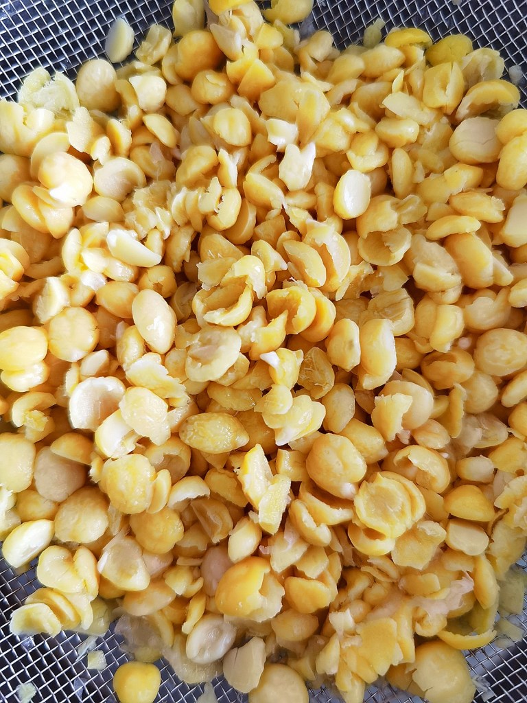 Нахута накиснах от вечерта. На сутринта го измих добре и сварих с добавената сода и сол на вкус. За успеха на рецептата е важно да е много добре сварен и дори разварен и да е без люспи. Готовия нахут, изсипах в гевгир, измих със студена вода и отцедих.