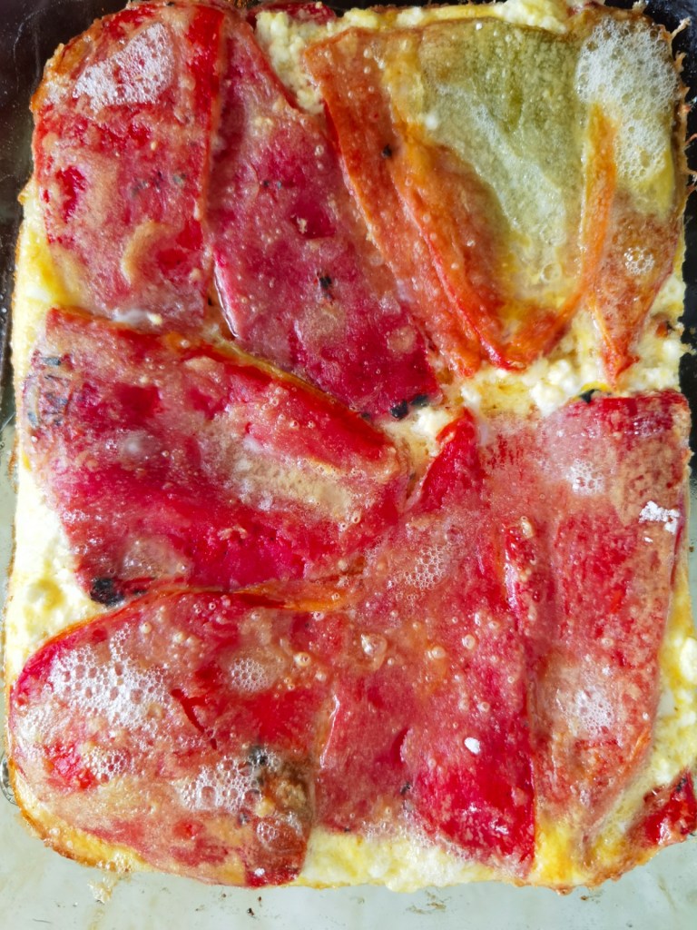 Стените и дъното на съд с размери 23х19х7 см. намазах с масло. Подредих плътен ред чушки и ги посолих. Върху тях разпределих половината извара и покрих с втори ред чушки, които не е нужно да са плътно, за да останах достатъчно за последния слой. И тях посолих, разпределих останалата извара и покрих с последния трети пласт чушки, които също посолих. В купа сложих яйцата, щипка сол и млякото и ги разбърках до гладка смес, която изсипах равномерно върху чушките. Оставих за 2 минути течността да се поеме от пластовете продукти, след което отгоре разположих парченца масло.