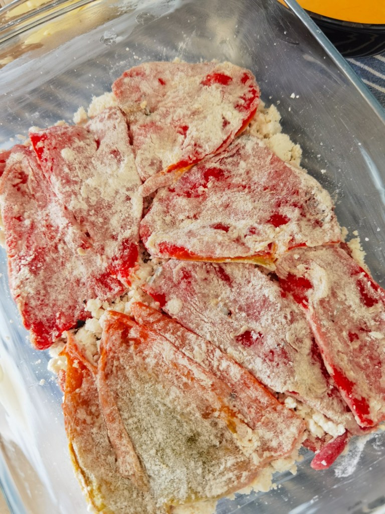 За направата на ястието използвах замразени капии, които размразих, разрязах на две и почистих от евентуално останали семена. Всяка чушка овалях от двете страни в брашно.