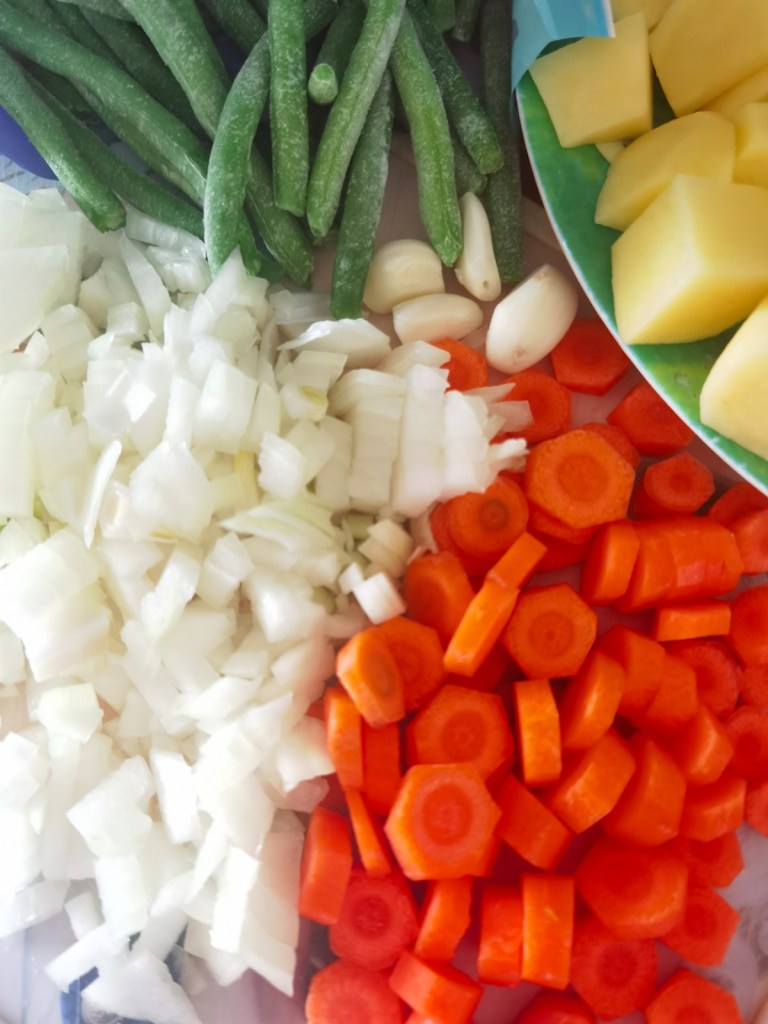 Обелените и измити картофи нарязах на средно големи парчета. Морковите обелих и нарязах на средно дебели шайби, а лукът на дребно. В широка тенджера загрях 2 с.л. масло и 2 с.л. олио и добавих лука и морковът, като ги посолих. Когато омекнаха и морковът отдели красивия си цвят, прибавих замразения зелен фасул, разбърках и готвих 3-4 минути. Прибавих нарязаните на 3-4 шайби скилидки чесън, разбърках и след минута добавих картофите, посолих и след 2-3 минути поръсих с червения пипер и джоджена и разбърках. След минута полях с 4 ч.ч. вряща вода (1 л.) и готвих под капак на 3 от 6 степени на моята печка за около 35 минути или до пълно омекване на фасула и картофите. Когато бяха напълно сварени, добавих брашното, смесено с 5-6 с.л. студена вода. Разбърках внимателно и готвих 3-4 минути, след което отстраних съда от котлона. Прибавих нарязаната на дребно листна част на магданоза. Сервирах ястието топло с хубав хляб.