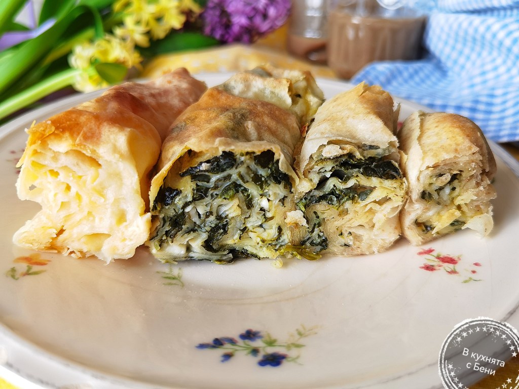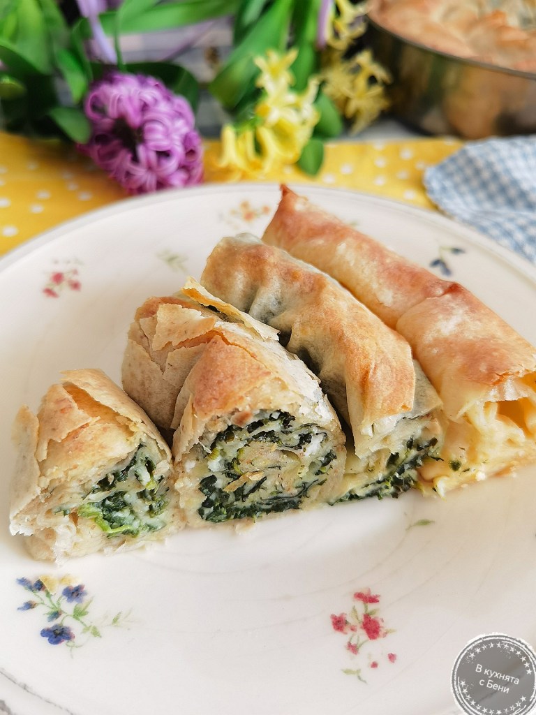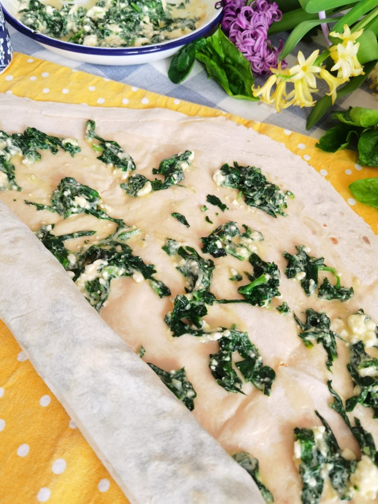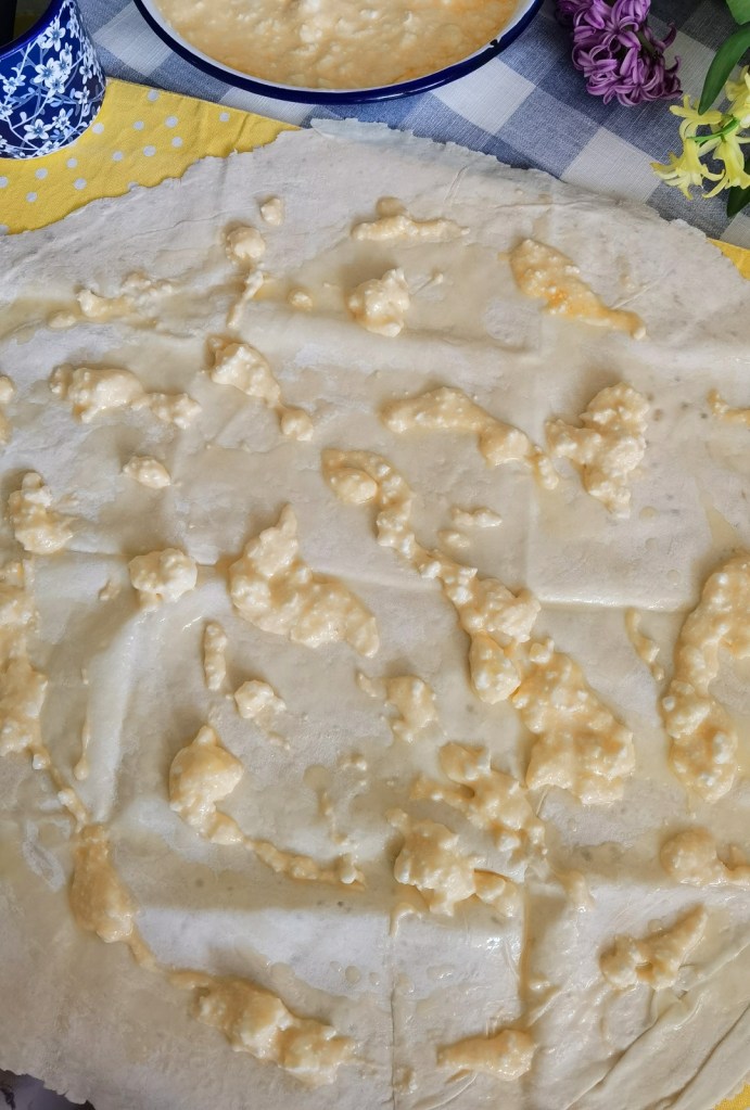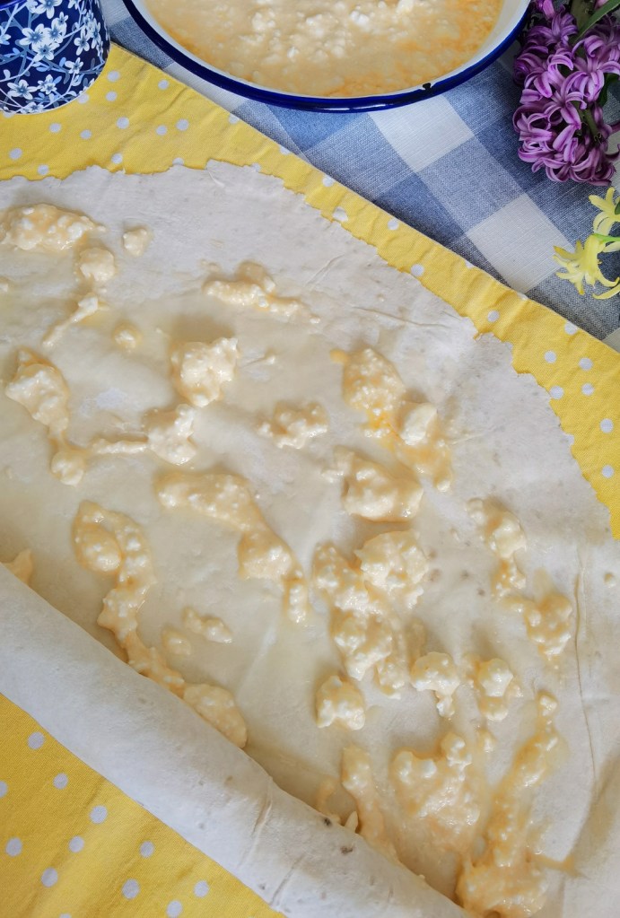 Взех първата кора, намазах я с мазнина и разпределих ¼ от сместа със сиренето и яйцата. Навих я на руло и поставих в тавата. По този начин приготвих и второ руло, но от пълнозърнеста кора.