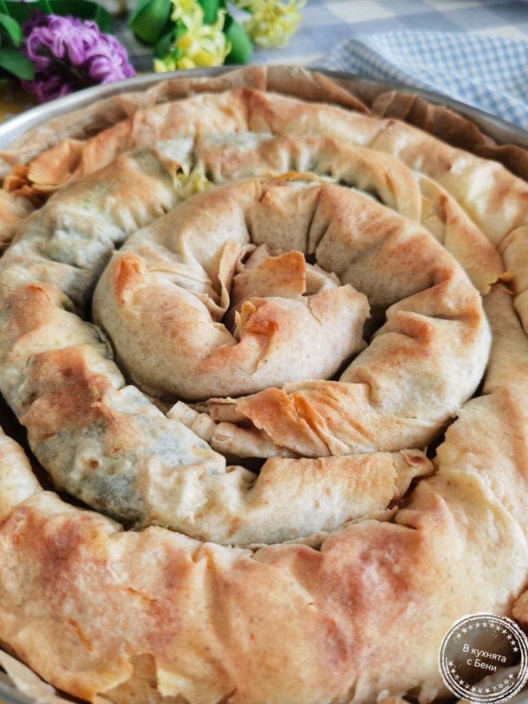 Отгоре ги намазах с останалата мазнина и сложих баницата да се пече в напълно загрятата фурна за около 35 минути или до апетитен загар и видима готовност. Изпечената баница оставих леко да се охлади и нарязах на парчета. Сервирах я с чаша разкошна боза, която мога да кажа, че е със същия вкус като онази от детството ми. Съставът й е изчистен и я препоръчвам горещо!
