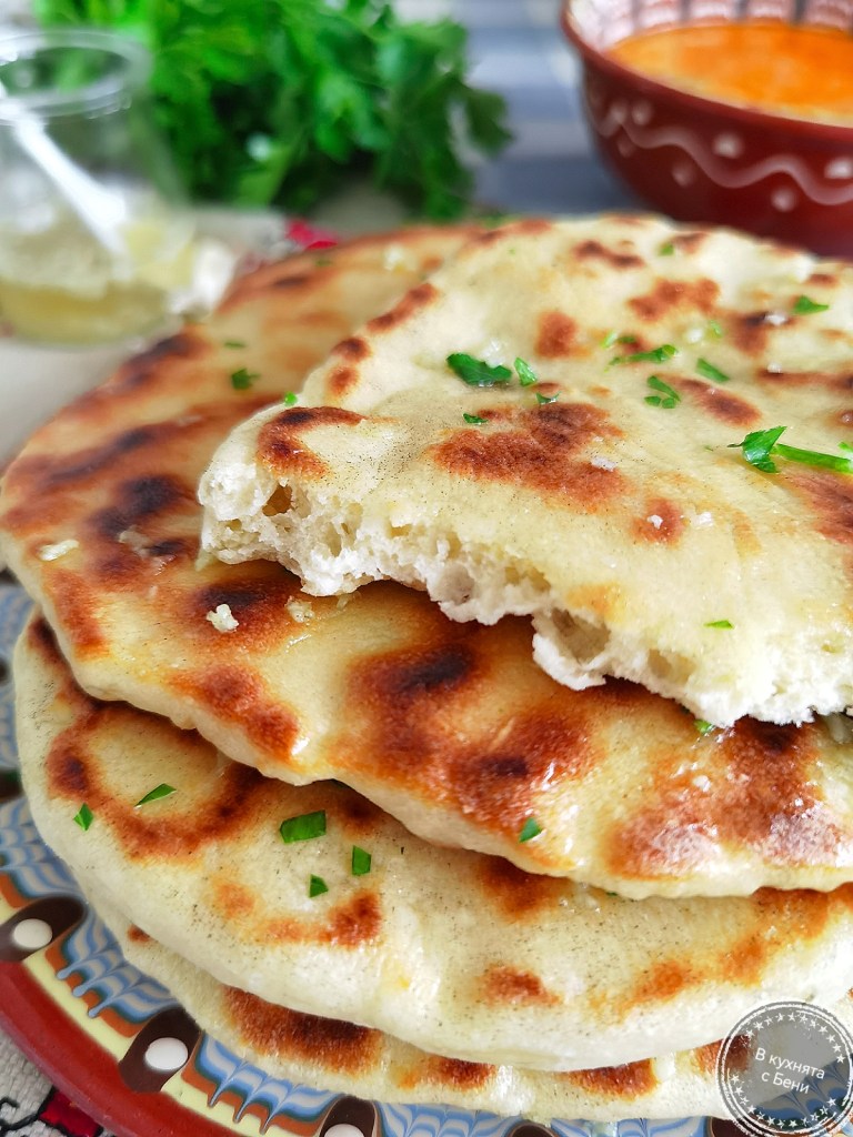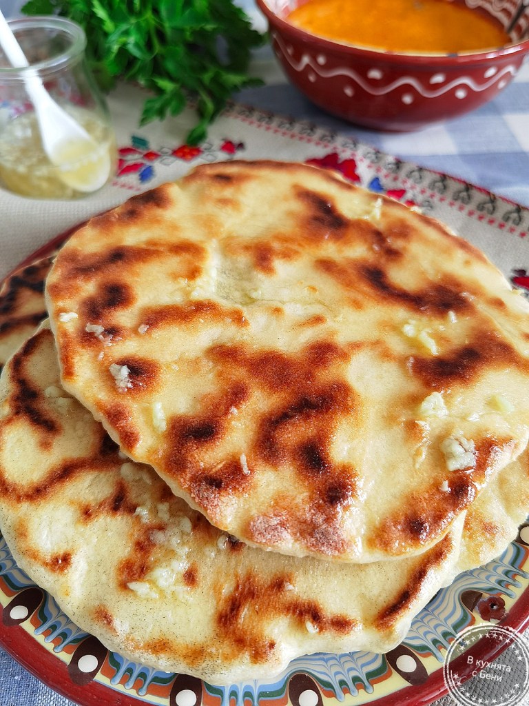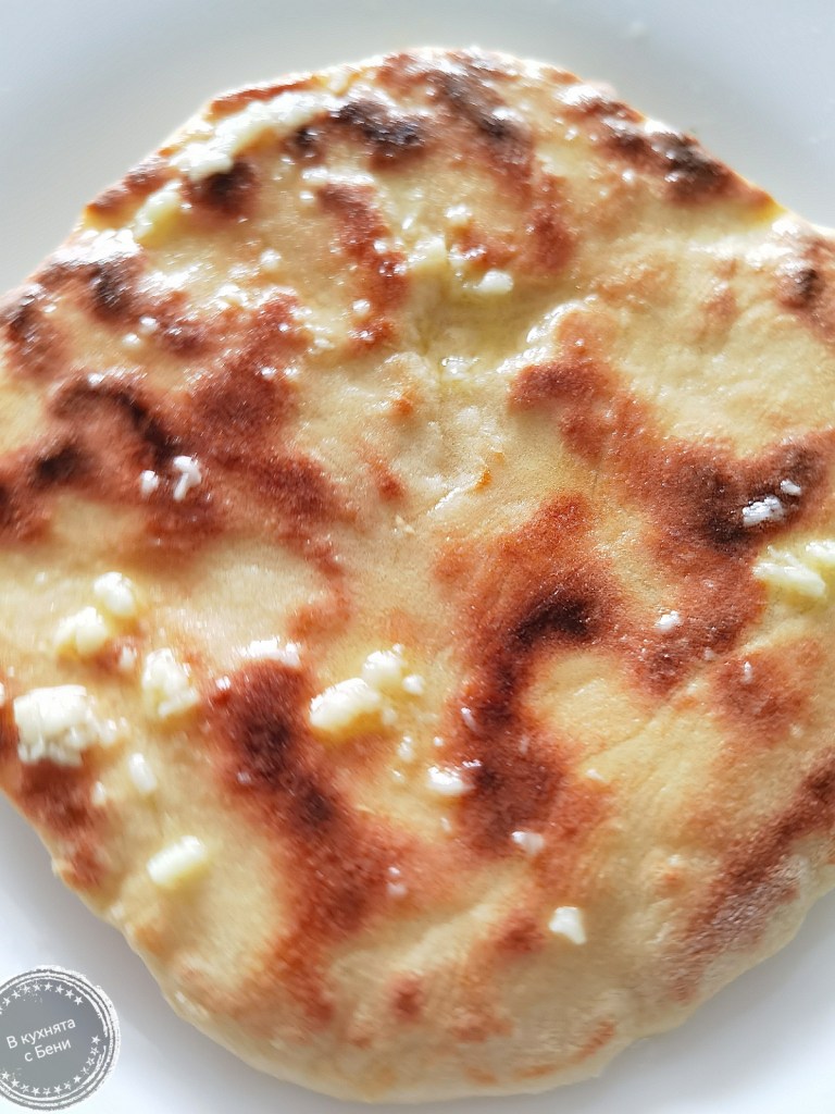 Котлона загрях на 4 степен от 6 на моята печка. За изпичането използвах тиган с керамично покритие. В добре загретия тиган сложих първата пърленка, като не използвам никаква мазнина! Бяха нужни около 3 минути, за да се запече добре, след което я обърнах от другата страна. Готовата пърленка намазах с чесновото масло. По този начин приготвих и останалите пет.