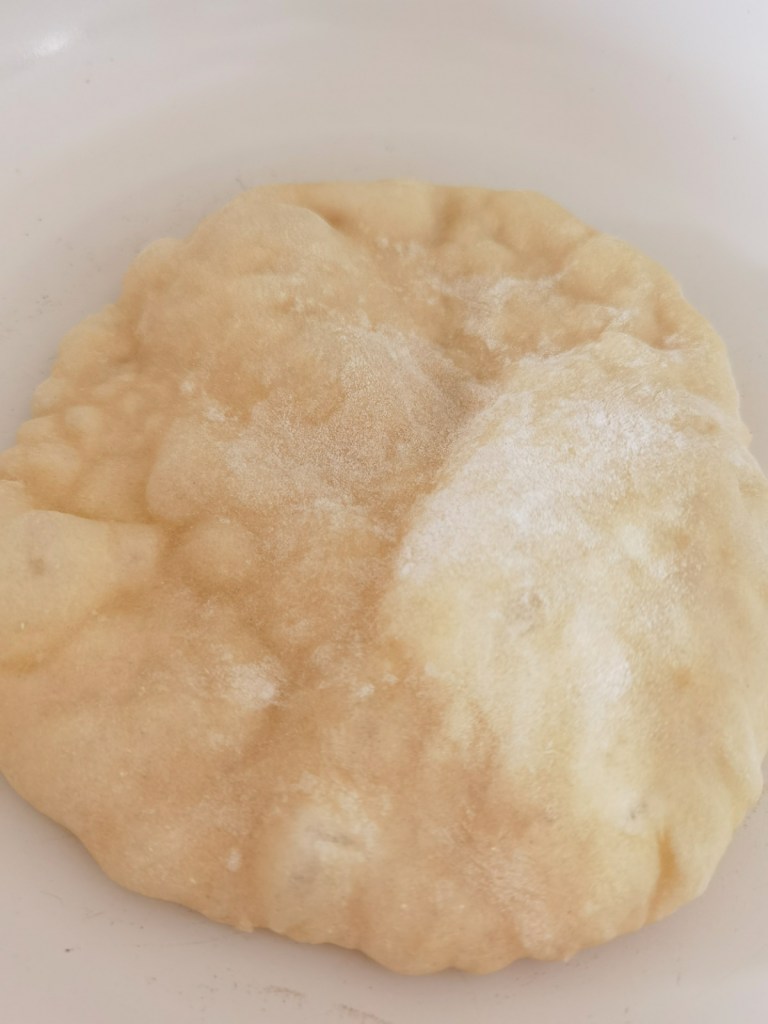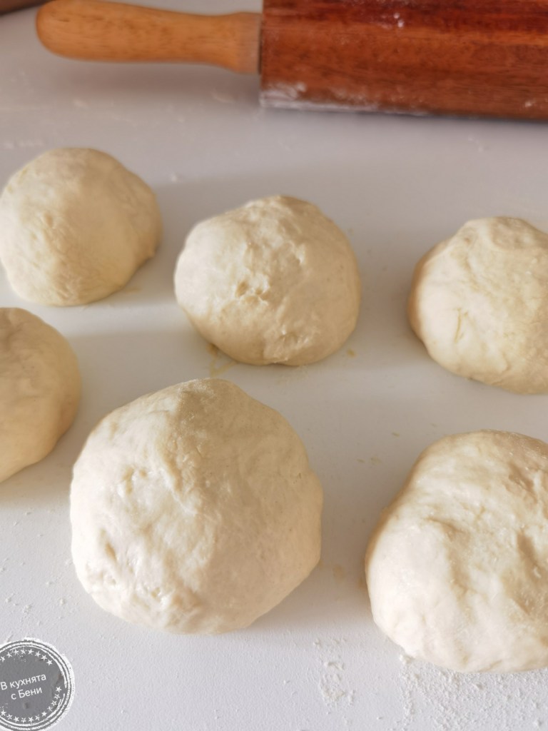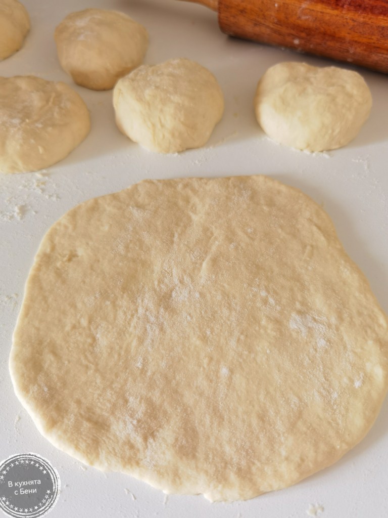 Брашното и бакпулвера пресях и сложих в купа. Добавих солта, разбърках и прибавих киселото мляко. Разбърках добре и така полученото тесто прехвърлих върху леко набрашнения плот и го омесих за 2-3 минути. Ако лепне, добавете още съвсем малко от допълнителното брашно, като целта е тестото да е много меко. Оформих фитил, който разрязах на 6 сравнително еднакви парченца. Всяко от тях оформих на топче, което след това разточих с кръгла форма и диаметър около 15 см. При разточването леко набрашнявах плота и дебелата точилка, която използвах.