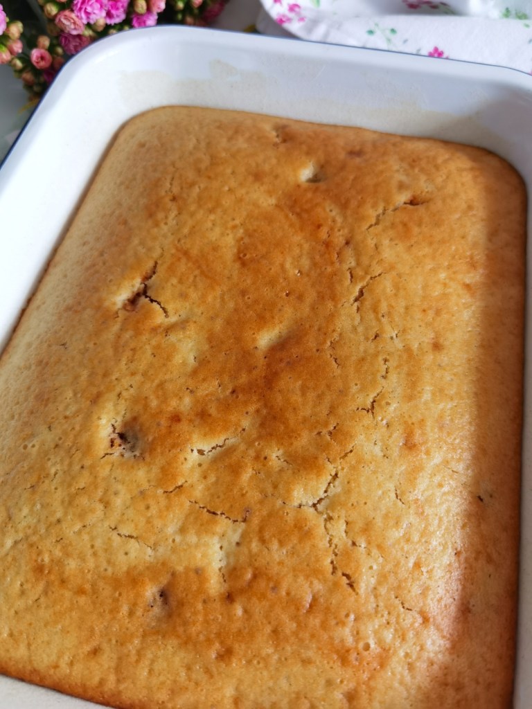 Тава с размер 28х22х5 см. намазах с малко олио и поръсих с брашно. Изсипах сместа и сложих сладкиша да се пече в загрята на 170 градуса фурна за около 25-30 минути или до видима готовност и суха клечка, прободена в най-високата част на печивото. Оставих го да се охлади напълно, след което го поръсих с пудра захар и разрязах на парченца.