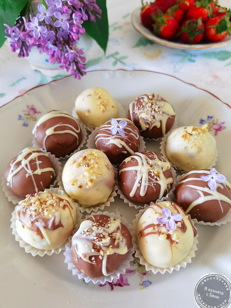 📌Рецептата търпи вариации. Може да не потапяте в шоколад, а да оваляте бонбоните в смлени ядки или кокосови стърготини.