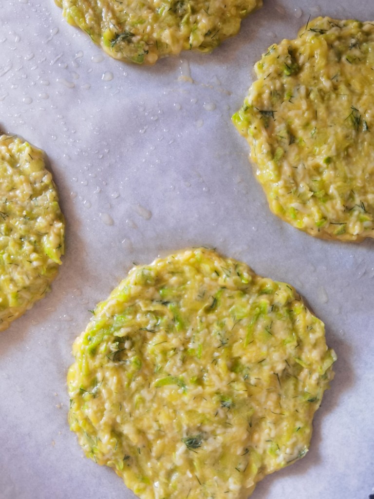 Тиквичките измих, подсуших и настъргах на едро без да ги беля. Посолих ги, разбърках и сложих в ситен гевгир, а него върху купа. Оставих да се отцедят за 20-ина минути. След това ги отцедих добре и с ръце и ги сложих в купа. Добавих яйцата, оризовото брашно, кашкавала, нарязаната на дребно листна част на копъра и мления пипер меланж. Разбърках добре. Тавата на фурната покрих с хартия за печене и я намазах с малко разтопена мазнина. С лъжица взех от сместа и поставих върху хартията, като притиснах и оформих кръг с диаметър около 10-11 см. Важно е да са тънки, за да могат да се сгънат добре след изпичането. Сложих да се пекат в загрята на 180 градуса за 10-15 минути или до видима готовност, без да ги препичам.
