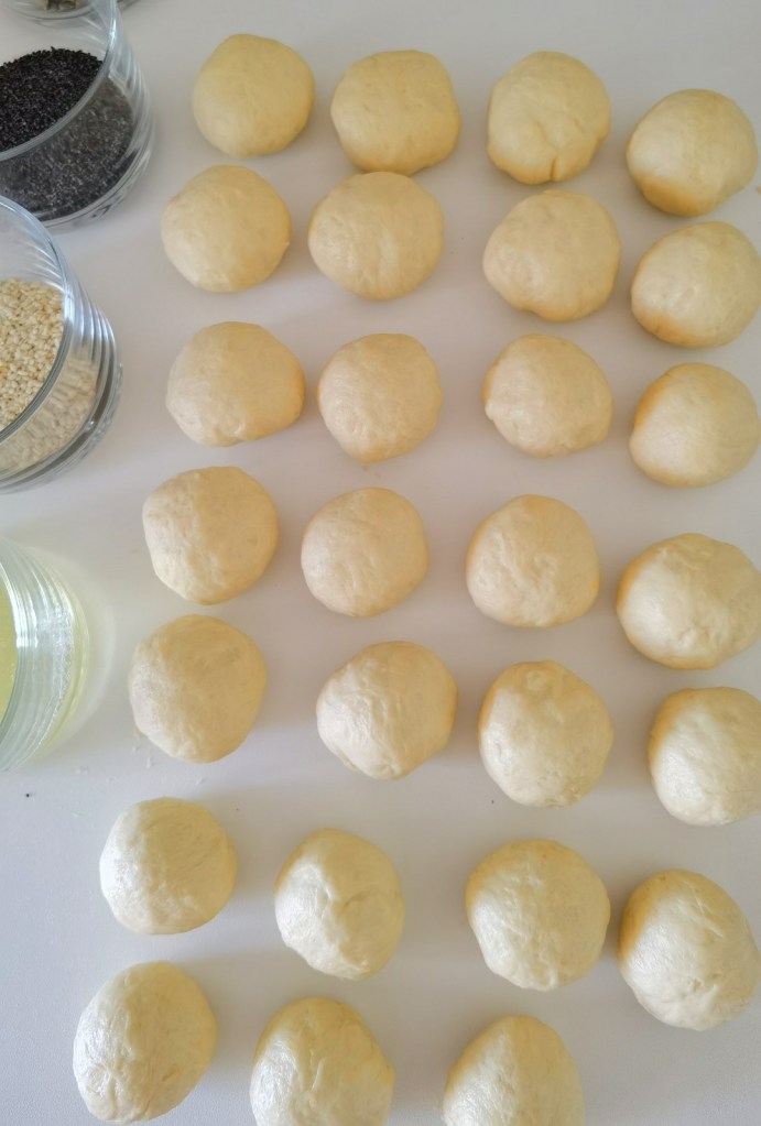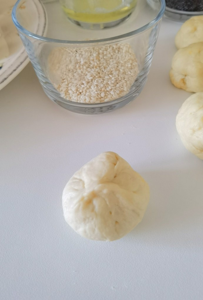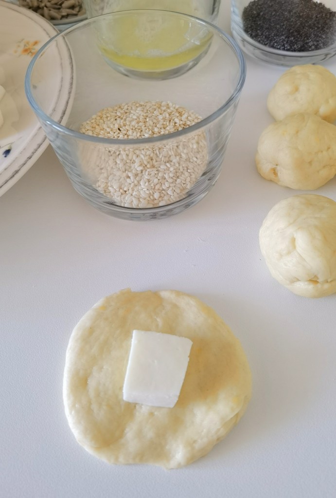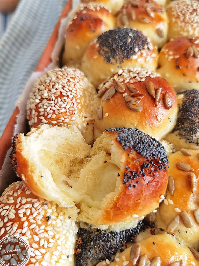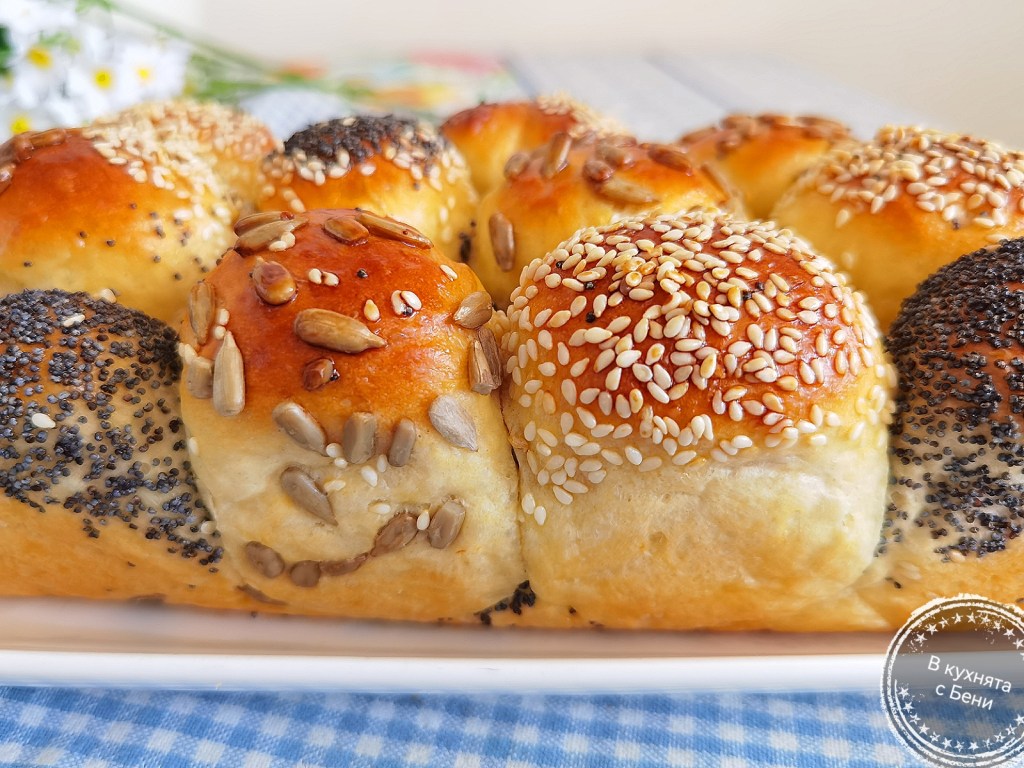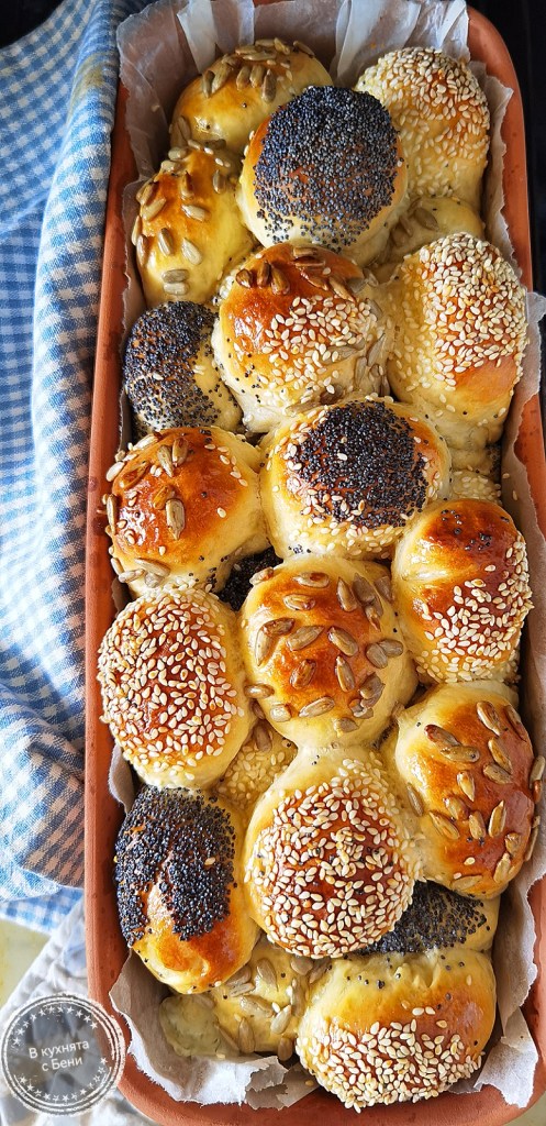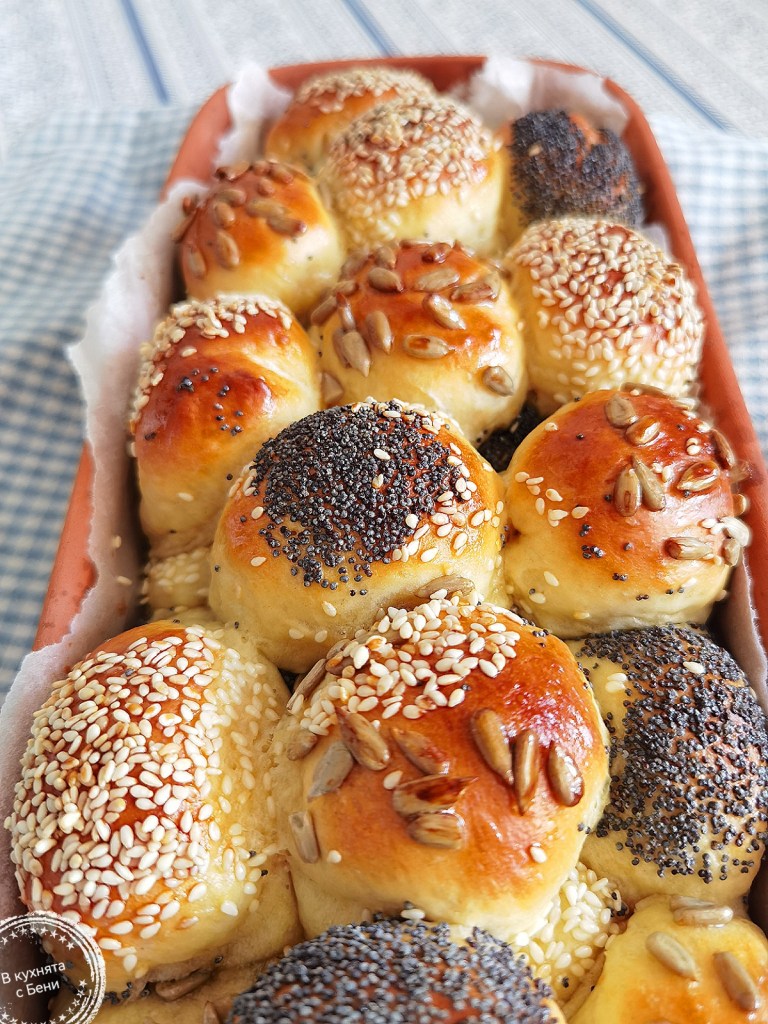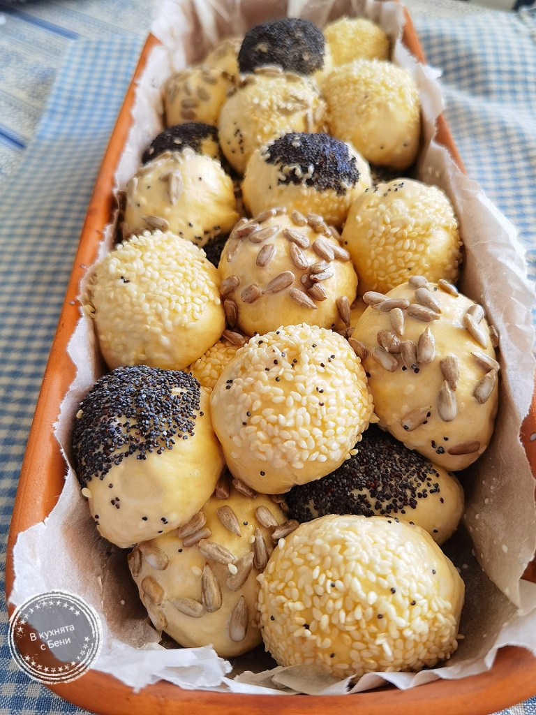 Когато всички бяха готови, потопих едната им страна в леко разбъркания белтък и овалях в избраните семена. Веднага ги поставях в съда, който бях покрила с хартия за печене, предварително намазана с масло. Покрих с фолио за свежо съхранение и оставих да втасат за 25-30 минути.