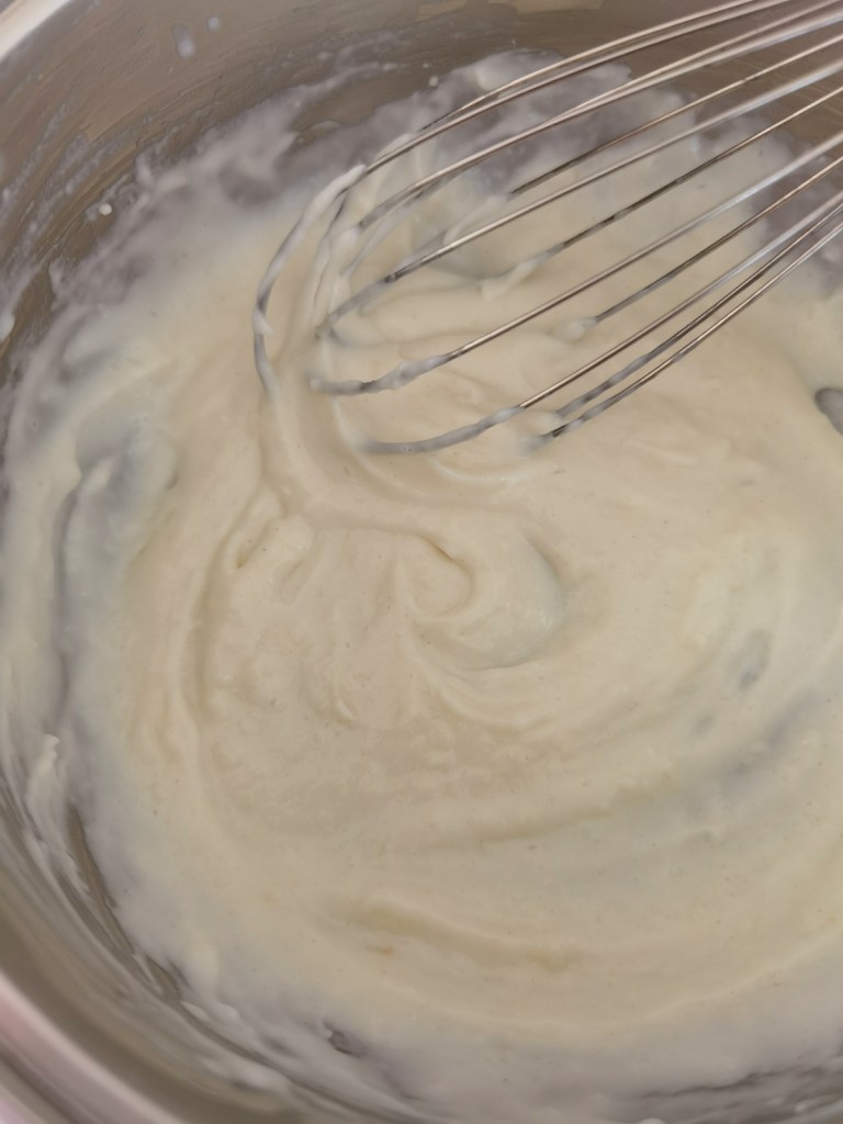 В малък съд сложих студеното мляко и брашното и ги разбърках с кухненска бъркалка. Сложих на котлона да се загреят до сгъстяване, при постоянно разбъркване. Така получената каша отстраних от котлона и оставих да изстине напълно.