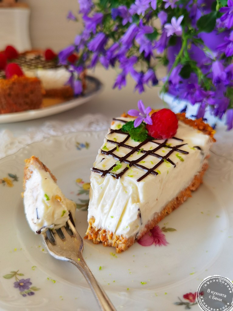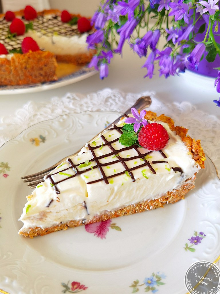 На сутринта внимателно извадих тортата от формата, поставих я в чинията за сервиране и внимателно отстраних хартията. На водна баня разтопих 40 г натурален шоколад и ½ ч.л. олио. С помощта на пош направих ивици за украса. Декорирах с малини и настъргах малко кора от лайм за допълнителна свежест.
