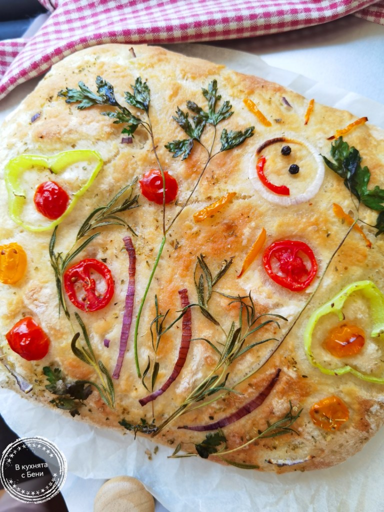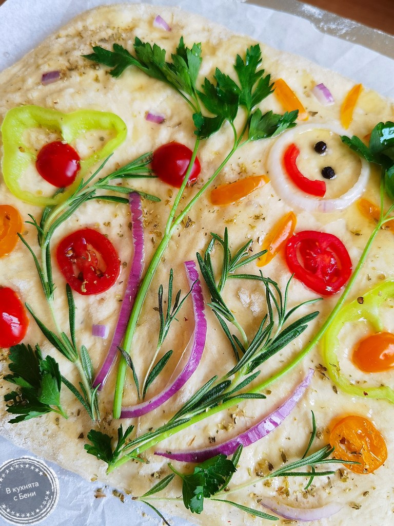 Днес ви представям една слънчева фокача, която приготвих без особени усилия и която се получи много пухкава, ароматна и вкусна. ☺️🌞🌿🌺🥧Хубавото на лятото е, че тестото втасва бързо и така по-лесно можем да приготвим хляб, с който да зарадваме семейството си. ☺️👩🍳🌞За направата на фокачата можете да включите и децата, които да дадат идея за украсата й. 😍Ще се радвам да я опитате и у вас да създаде слънчево настроение.☺️🌞🌻
