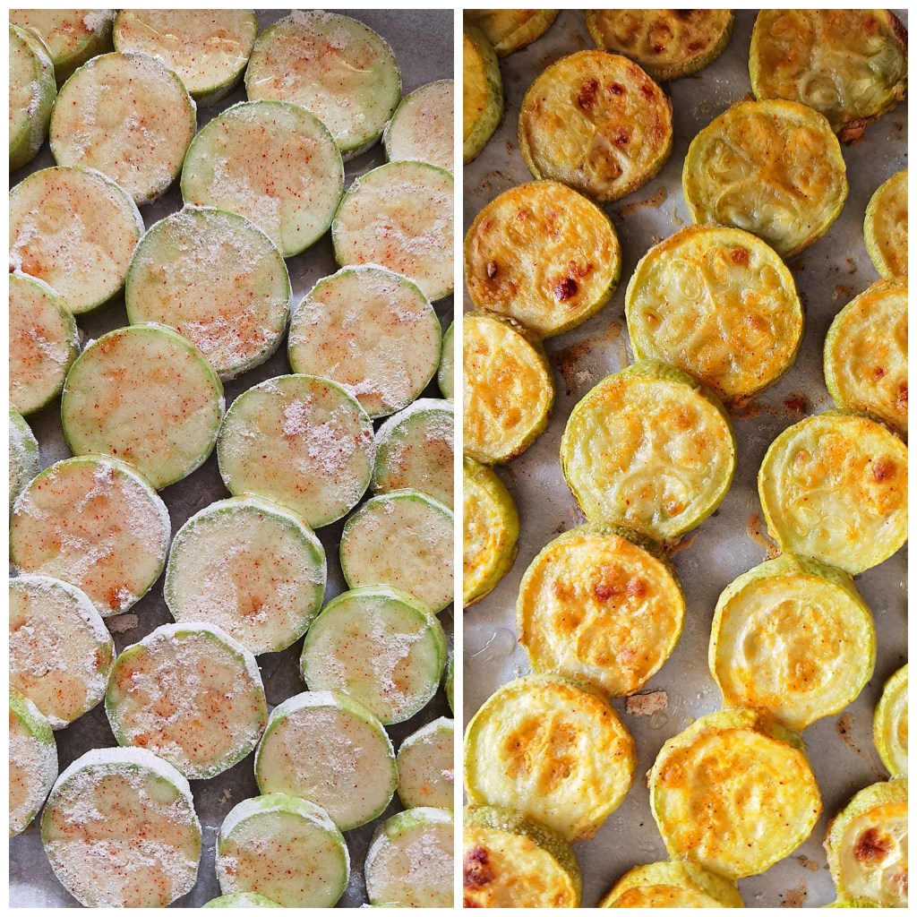 Тиквичките измих добре, подсуших и нарязах на колелца с дебелина 5-6 мм. Тавата на фурната покрих с хартия за печене и с четка я намазах съвсем леко с олио. В плитка чиния смесих брашното, солта и червения пипер. Всяка тиквички овалях в тази суха смес, леко изтръсках, за да падне излишното и подредих в тавата, като ги застъпвах съвсем леко. С помощта на четката ги покапах с олиото и сложих да се пекат в напълно загрята на 200 градуса фурна. Нужни бяха 30 минути, за да се изпекат добре и да получат апетитен загар. Готовите тиквички оставих да изстинат напълно.