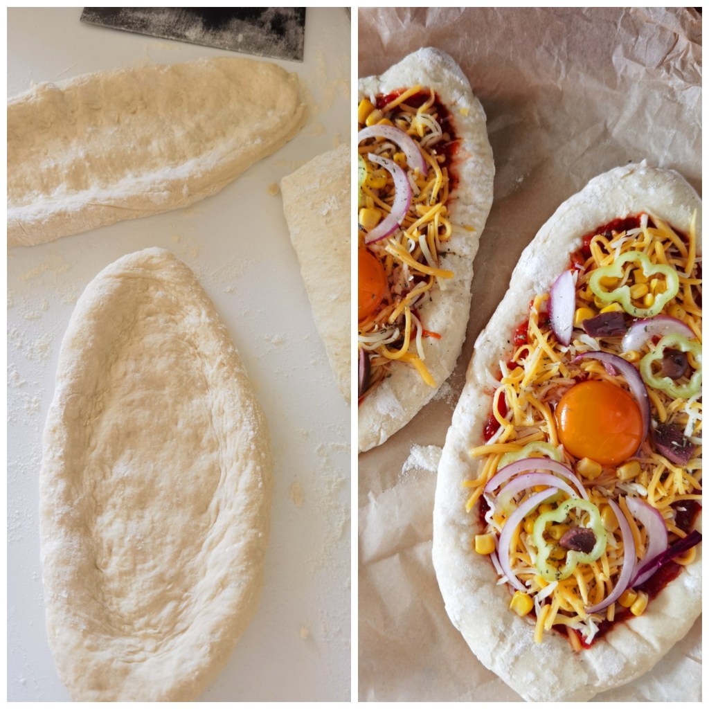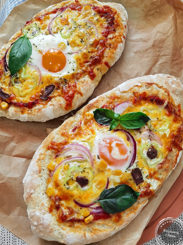 Втасалото тесто прехвърлих върху набрашнения плот и без да го притискам, разрязах на четири равни части. Двата края използвах за мини пиците, а средните за чабатите. Взех двата края и ги оформих с пръсти, като се старах основата да е по-тънка, а бордът по-плътен, без да го притискам. Пицата пека върху хартия за печене, за да пазя плочата чиста. Затова с помощта на лопатката за пица прехвърлих оформените теста върху хартията. Оставих ги да втасат за времето, в което загрях плочата или около 15 минути. След това ги намазах тестото с доматения сос, като не стигах до борда. Разпределих равномерно кашкавалите и оформих вдлъбнатина, в която сложих по 1 яйце. Сложих резени червен лук, маслини и чушки и поръсих с още малко риган и няколко пръски зехтин. С помощта на лопатката преместих пиците заедно с хартията върху напълно загрятата плоча. Пекох ги при температура 250 градуса за около 10 минути или до видима готовност и апетитен загар. Ако фурната ви разполага с вентилатор, го включете за последните 2 минути, за да получите хубав загар на борда. Моята не разполага. Сервирах ги топли.