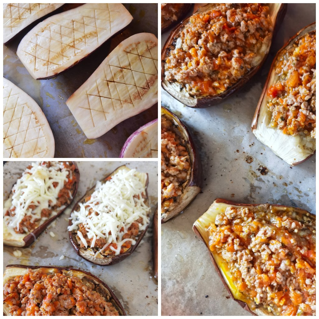 Патладжаните измих, подсуших и разрязах на две равни половини. С остър нож направих дълбоки прорези, които леко разтворих и посолих. Оставих настрана за около 30 минути, за да си пуснат евентуалния горчив сок. Когато това се случи, ги попих с домакинска хартия и сложих в подходяща като размер тава. Намазах ги с по 1 ч.л. зехтин и сложих да се пекат в загрята на 190 градуса фурна. Пекох ги около 30 минути, през което време приготвих плънката.