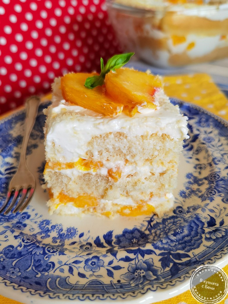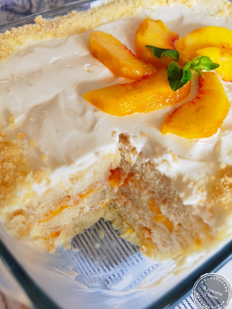 На дъното на форма с размери 24х19х8 см. разположих плътен ред бишкоти, които потопих за 3-4 секунди в студеното мляко. Не трябва да престояват повече в течността, защото ще се разкашкат, а и те поемат от влагата на крема и сока на плодовете и омекват още. Намазах ги с 1/3-та от крема и разположих половината плодове. Сложих втори ред потопени за кратко бишкоти, крем и праскови и завърших с трети ред потопени в мляко бишкоти и завърших с останалия крем. Покрих съда с фолио за свежо съхранение и го прибрах за през нощта в хладилника. На сутринта го украсих съвсем аматьорски със смляна бишкота и резени праскова.
