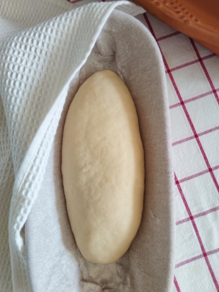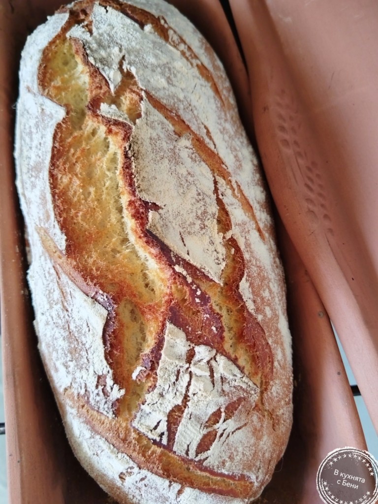В купа сложих хладката към топла вода, олиото и половината от брашното. Добавих сухата закваска и разбърках. Прибавих солта и част от останалото брашно и когато се оформи меко тесто, го прехвърлих върху набрашнен плот и омесих за 3-4 минути. Тестото трябва да е меко и леко лепнещо. Ако добавяте още брашно, хлябът ще стане по-плътен. Леко издължих тестото и го сложих в набрашнения продълговат панер. Покрих го с памучна кърпа и оставих да втаса на стайна температура, докато утрои обема си. Предвид топлото време, това отне 1 час. Важно е да втасва бавно, а не да ускоряваме процеса, като го сложим до топлинен източник!