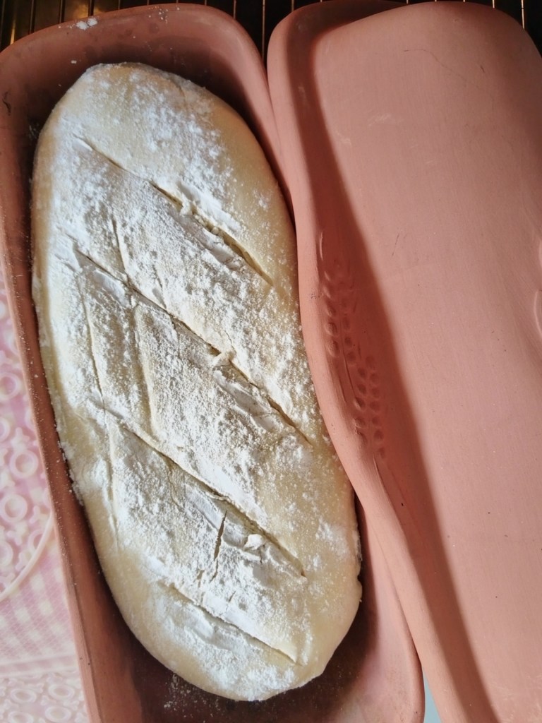 Съда за печене (основата и капака) сложих в студена фурна и я включих на 250 градуса. Тестото обърнах директно върху горещата долна част на съда. Направих няколко прореза, покрих с капака и сложих във фурната за точно 30 минути.