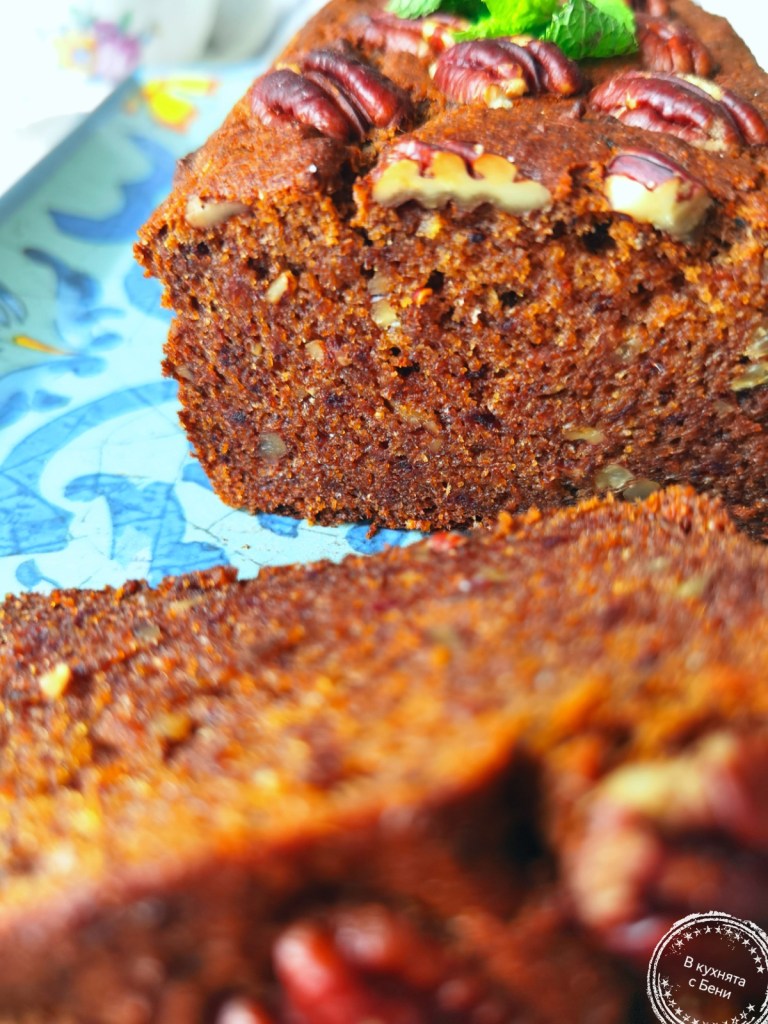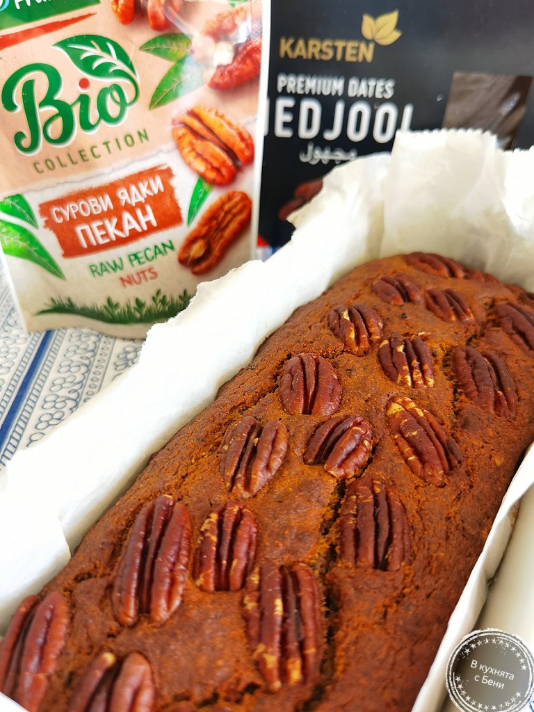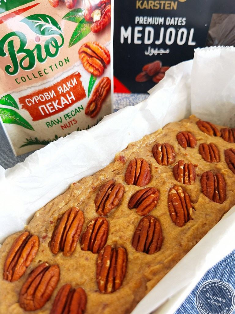 Форма за кекс с размер 24х11х7 см. покрих с хартия за печене, която леко намазах с масло. Разпределих сместа и отгоре подредих отделените 20 пекан ядки, като леко ги притиснах. Сложих кекса да се пече в загрята на 170 градуса за около 45-50 минути или до видима готовност и суха клечка, прободена в най-високата част на печивото.
