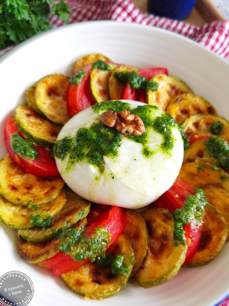 В чиния подредих продуктите, като редувах парче домат и тиквички, а в средата разположих отцедената бурата. Допълних с пестото и поднесох с усмивка!