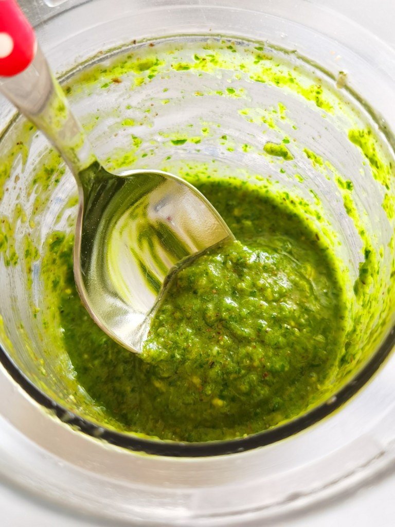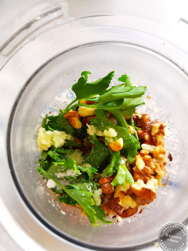 Пестото приготвих, като сложих всички съставки в приставката за мелене на ядки на кухненския робот и пасирах за около минута.