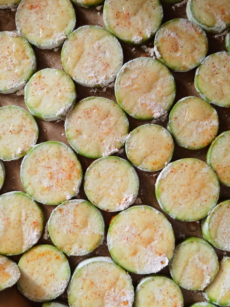 Тиквичката измих добре, подсуших и нарязах на колелца с дебелина 4-5 мм. Тавата на фурната покрих с хартия за печене и с четка я намазах съвсем леко с олио. В плитка чиния смесих брашното, солта и червения пипер. Всяка тиквички овалях в тази суха смес, леко изтръсках, за да падне излишното и подредих в тавата. С помощта на четката ги покапах с олиото и сложих да се пекат в напълно загрята на 200 градуса фурна. Нужни бяха 25 минути, за да се изпекат добре и да получат апетитен загар. Готовите тиквички оставих да изстинат напълно.