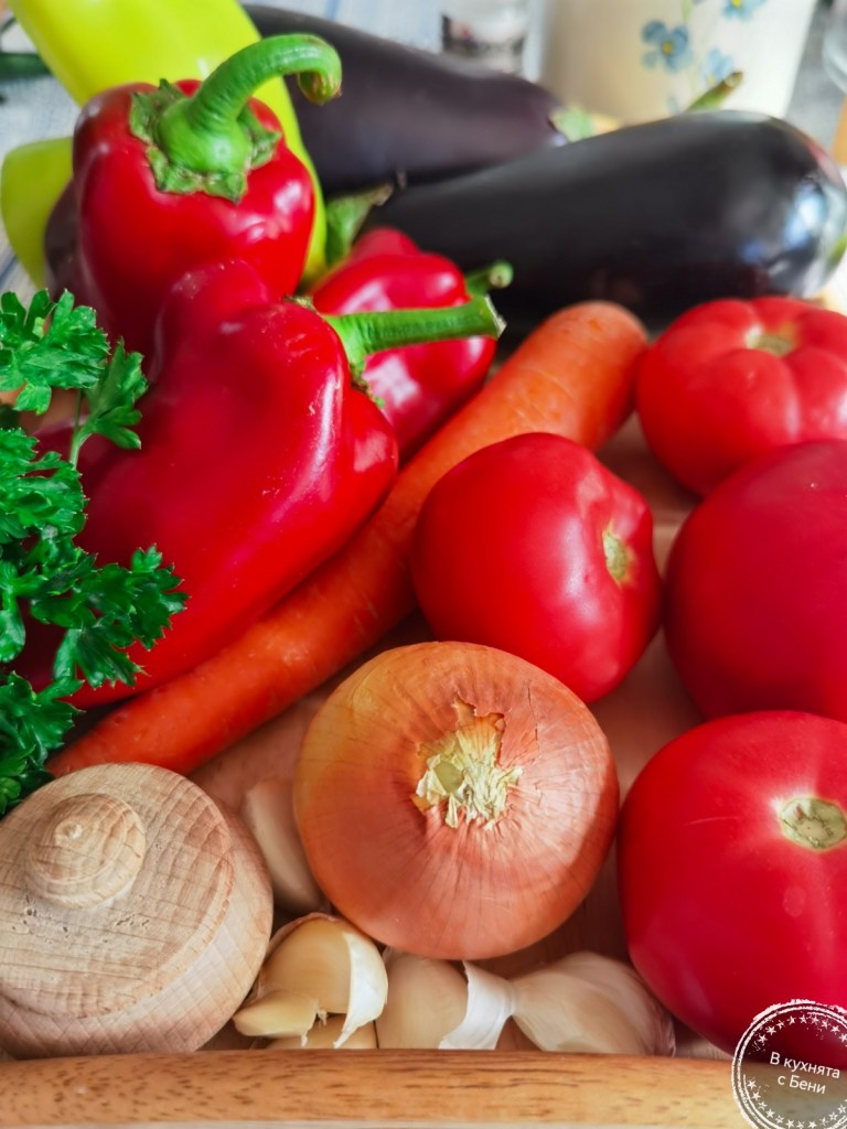 Двата вида чушки нарязах на малки парченца. Моркова настъргах на едро ренде. Лука нарязах на едро, а скилидките чесън на средно дебели филийки. Доматите обелих и нарязах на дребно.