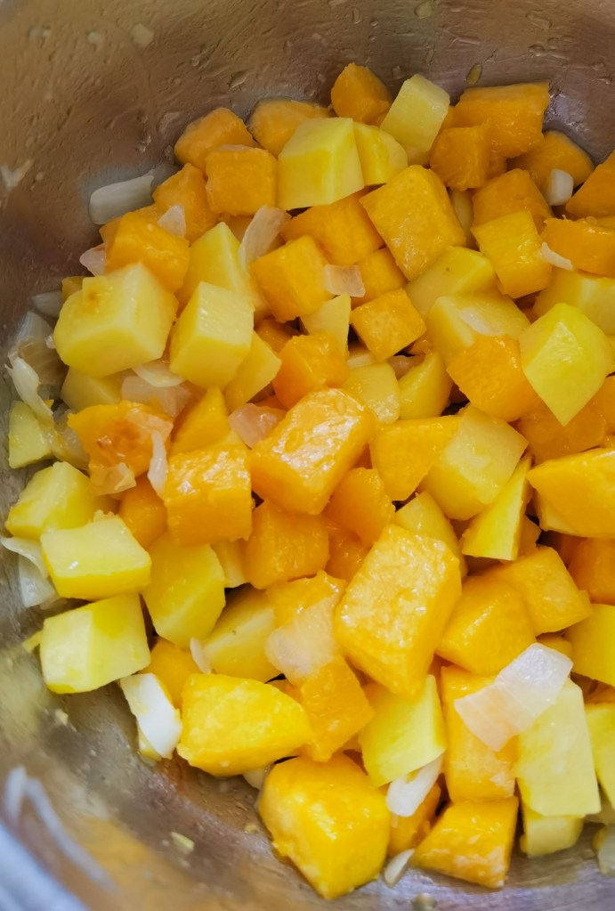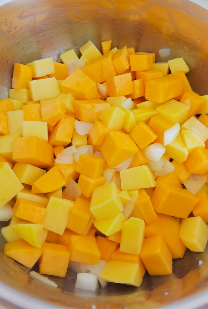 Обелената тиква и картофа нарязах на малки кубчета. Лукът нарязах на едро. В средно голяма тенджера загрях 2 с.л. масло и добавих зеленчуците, като ги посолих. Готвих, докато започнаха да омекват, след което полях с прясното мляко, което бе студено.