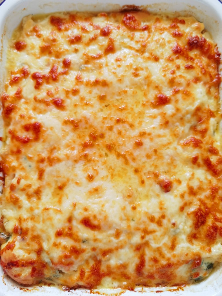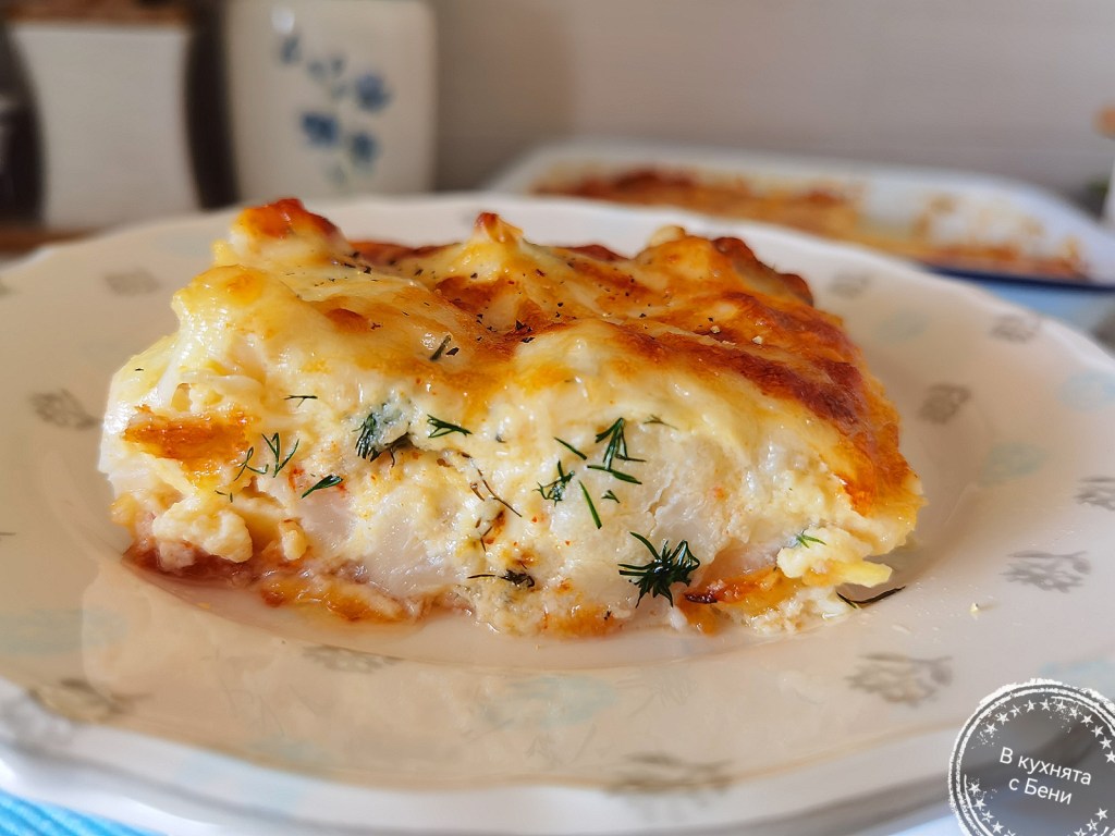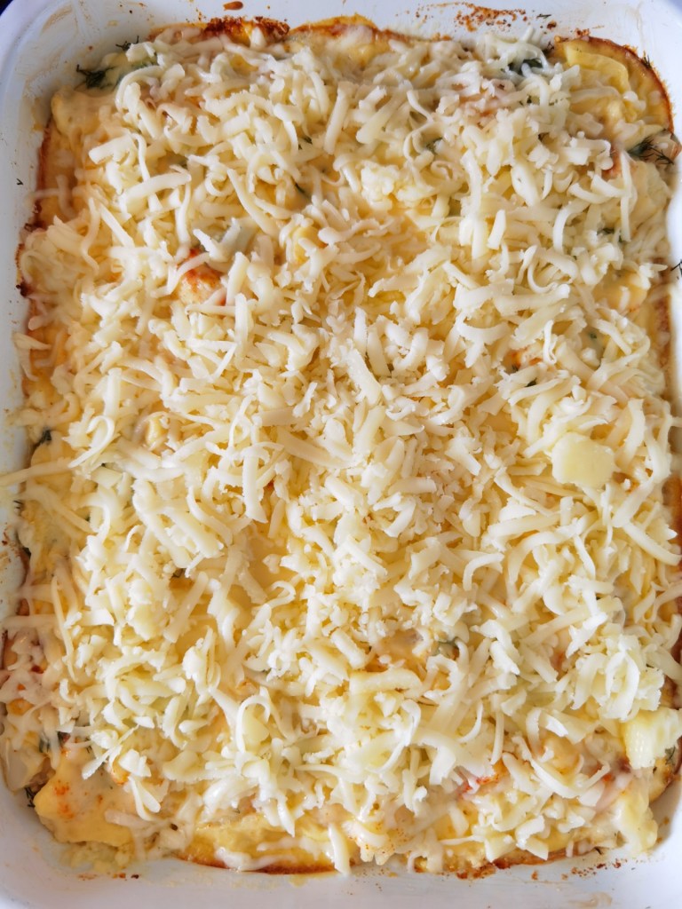 Сложих го да се пече в загрята на 180 градуса фурна за около 20 минути. Щом ястието се позапече, го поръсих с настъргания кашкавал и допекох до апетитен загар.