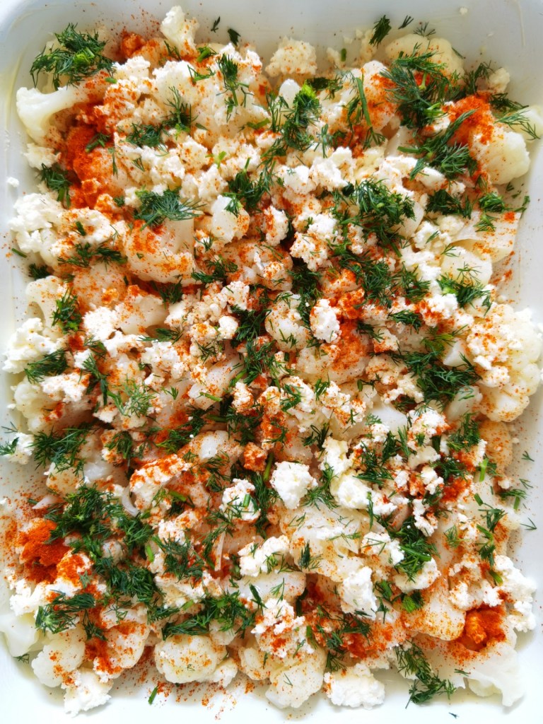 Карфиола в тавата поръсих с натрошеното на дребно сирене, червения пипер и ситно нарязания копър. Отгоре разпределих равномерно соса и на няколко места сложих малки парченца масло.