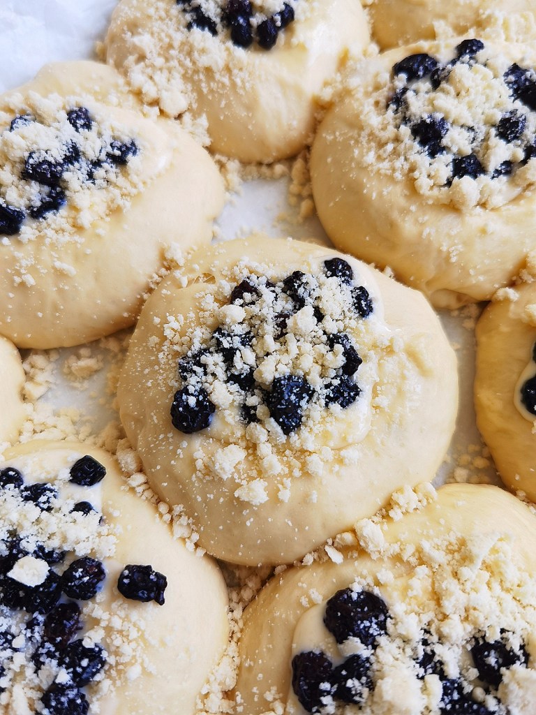 Тава с размер 36х26х5,5 см. покрих с хартия за печене и леко я намазах с разтопено масло. Втасалото тесто освободих от въздуха и започнах да късам малки топчета, които дооформих и разположих на разстояние едно от друго. Получих 12 средно големи топчета. Малка лъжица намазних и натискайки направих вдлъбнатини в питките. На няколко пъти трябваше да я намазня още малко, като използвах един от съдовете, в които бях разтопила масло за другите стъпки от рецептата. В отворите сложих от кремообразната смес и боровинки и поръсих с маслените трохи.