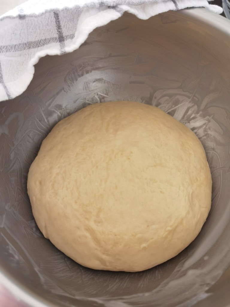 От топлото, но не горещо мляко отделих 100 мл. и в тях добавих 1 ч.л. от предвидената захар, маята и 1 ч.л. брашно. Разбърках и оставих да шупне за 10-ина минути. В дълбока купа сложих яйцето, захарта, ваниловата захар и солта и ги разбърках с кухненска бъркалка за минута. След това прибавих шупналата мая, останалото хладко мляко и разбърках. Постепенно добавих пресятото брашно и разбърках до образуване на тесто. Сложих го върху плота и омесих, като на порции добавях от разтопеното масло и месих до усвояването му. Това отне не повече от 5 минути. Дори на моменти да ви се струва, че тестото лепне, не се тревожете, защото бързо става еластично, гладко и нелепнещо. Почистих купата, намазах я с малко разтопено масло и разположих тестото, като го обърнах веднъж, за да се намасли и от другата страна. Купата покрих с фолио за свежо съхранение и кърпа и оставих да утрои обема си. Тъй като тестото съдържа захар, втасва малко по-бавно, около 2 часа.