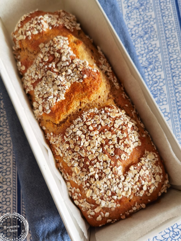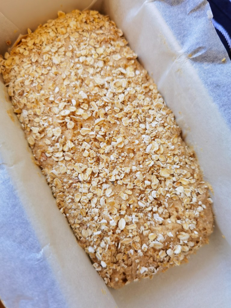Правоъгълна форма за кекс покрих с хартия за печене. В единия й край разпределих сместа, като я оформих с дължина около 18-20 см. на снимката се вижда добре. Ако имате по-къса форма, ще ви свърши чудесна работа. Поръсих с овесените ядки и леко загладих повърхността на хлебчето.
