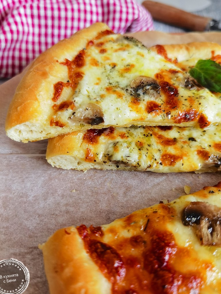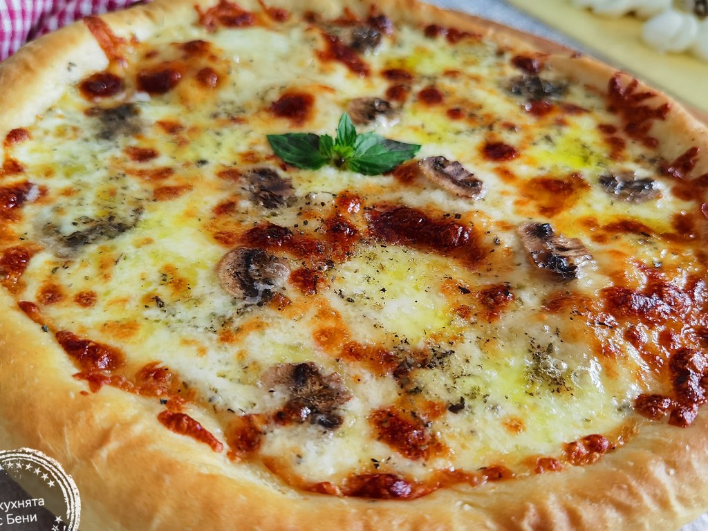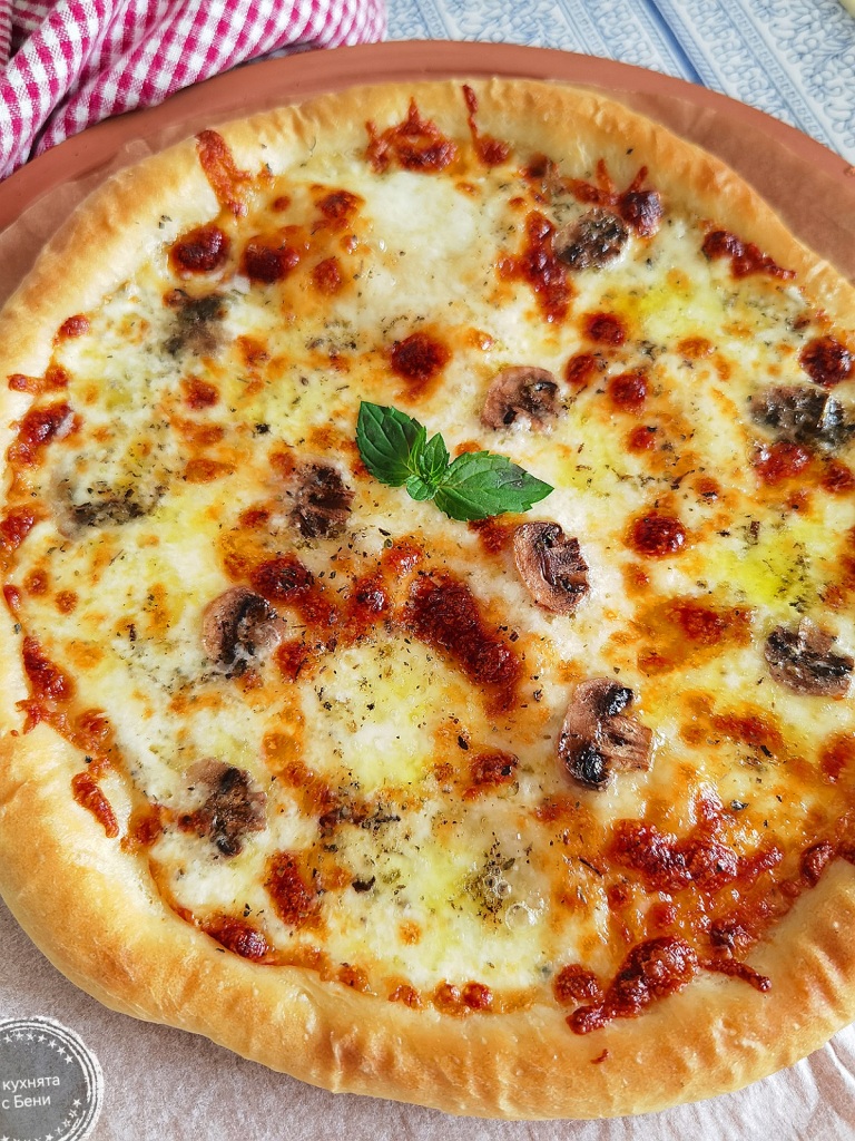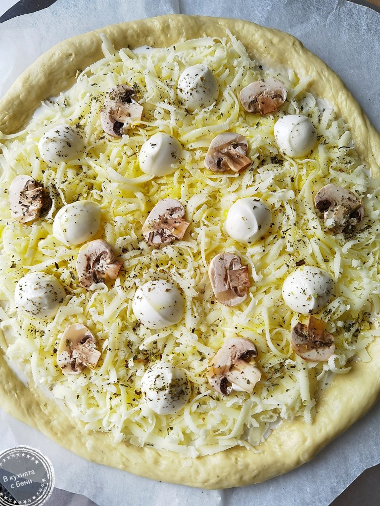 Оформения блат намазах с 3-4 с.л. сметана и гарнирах с настъргания кашкавал, перлите моцарела и нарязаните на филийки гъби, като накрая леко поръсих с риган и няколко пръски зехтин.