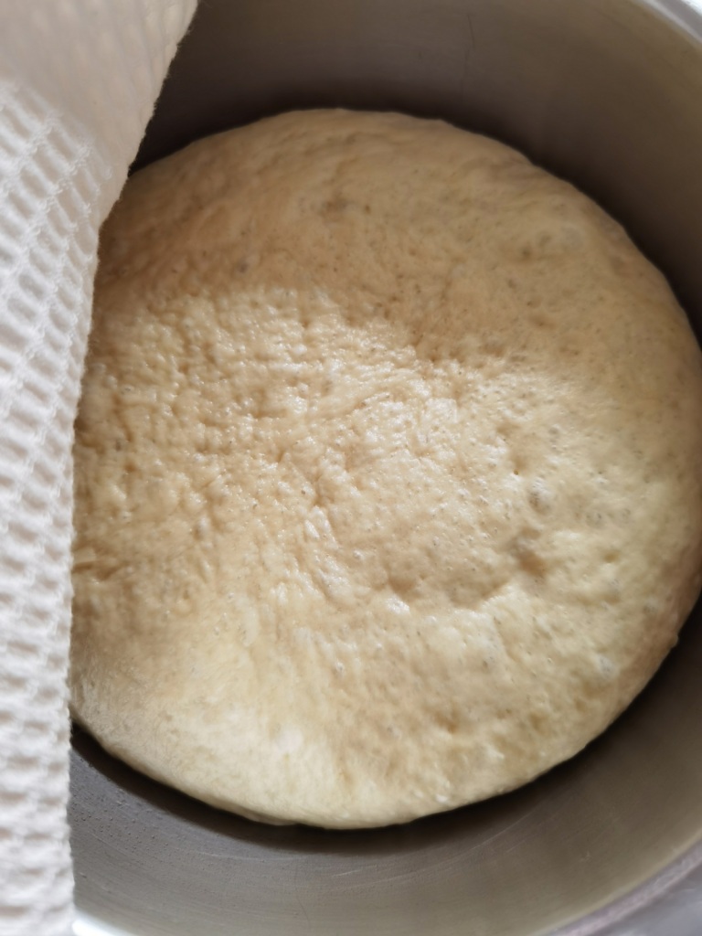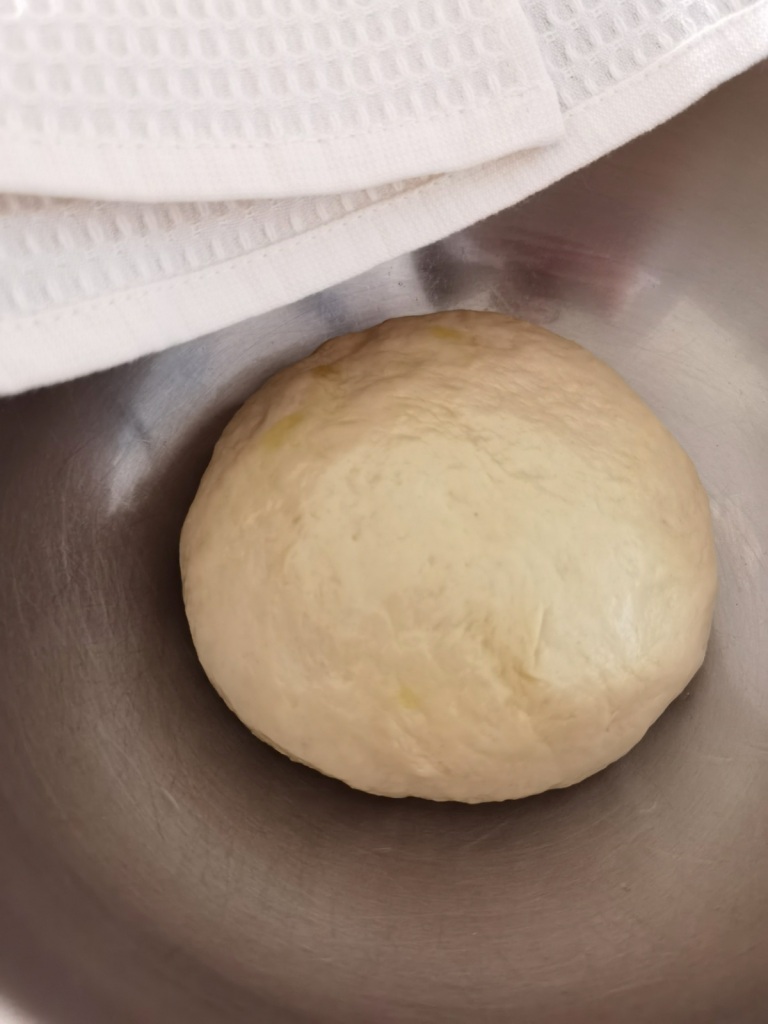 В купата, в която ще замеся тестото сложих сухата мая, брашното, захарта и разбърках. Полях с хладката към топла вода и разбърках до гладка смес. Покрих купата с кърпа и оставих за 15-ина минути да шупне. След това добавих част от пресятото брашно, зехтина и малко от водата и разбърках. Постепенно добавих и останалото брашно, солта и останалата вода. В купата замесих меко тесто, което прехвърлих върху набрашнения плот и доомесих за 3-4 минути, като ми бяха нужни още около 1-2 с.л. брашно, за да не лепне тестото. Не добавяйте твърде много брашно, за да не стане твърдо тестото! Същата купа мазаха със зехтин и поставих тестото, което също намазах с малко от мазнината. Купата покрих с фолио за свежо съхранение и с кърпа и оставих за около 1 час и половина или докато утрои обема си.