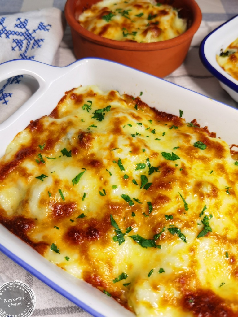 Сложих ястието да се пече в загрята на 180 градуса фурна за 20-ина минути или до апетитен загар. Сервирах го топло, поръсено със ситно нарязан магданоз.