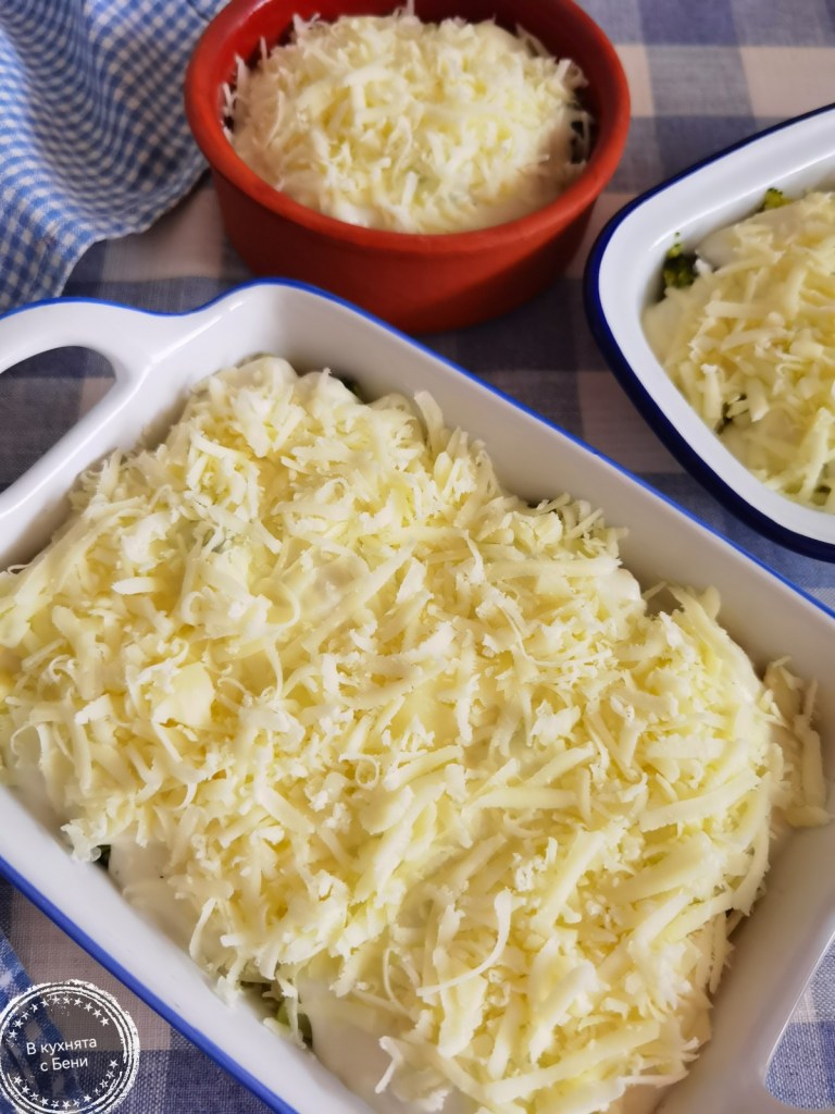 Картофите обелих, нарязах на средно големи кубчета, измих ги и сложих да се варят в подсолена вода. Когато започнаха да омекват, добавих средно големите розички броколи и варих 5-8 минути или до желаното ниво на готовност. Отцедих ги и разположих в три съда за печене, два от които са индивидуални, а третият е с размер 20х15х6 см. и които бях намазала с масло. Ако е нужно, посолете на вкус. Разбира се, вие може да приготвите ястието в една тава или само в индивидуални съдове.