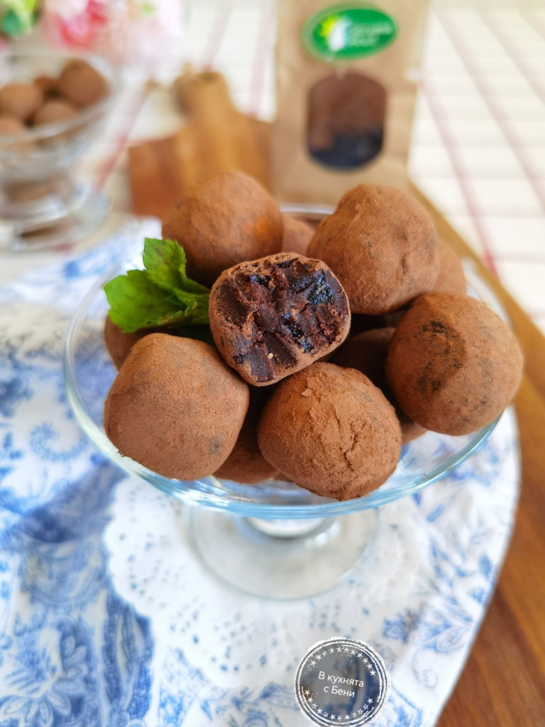 На сутринта взех с лъжичка от добре охладената смес и с длани оформих бонбони, които овалях в какао. Получих 20 броя с диаметър около 3 см. Добре е бонбоните да не са нито твърде малки, нито прекалено големи. Съхраняват се в хладилник.