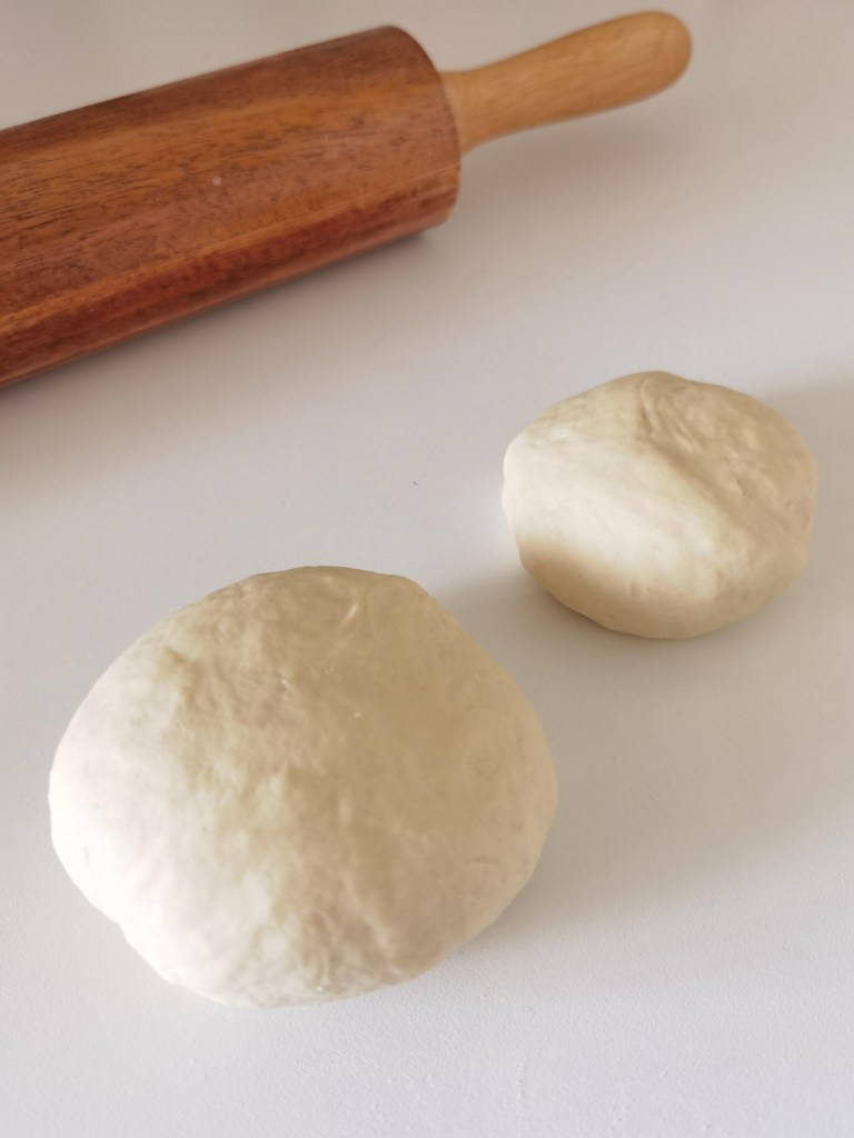 В средно голяма купа сложих оцета, солта, водата и разбърках. Постепенно прибавих брашното, докато се получи меко тесто. Прехвърлих го върху набрашнения плот и омесих за 2-3 минути. Разделих го на две топки, като едната е по-голяма. Покрих ги с кърпа и оставих да си починат за 15 минути.