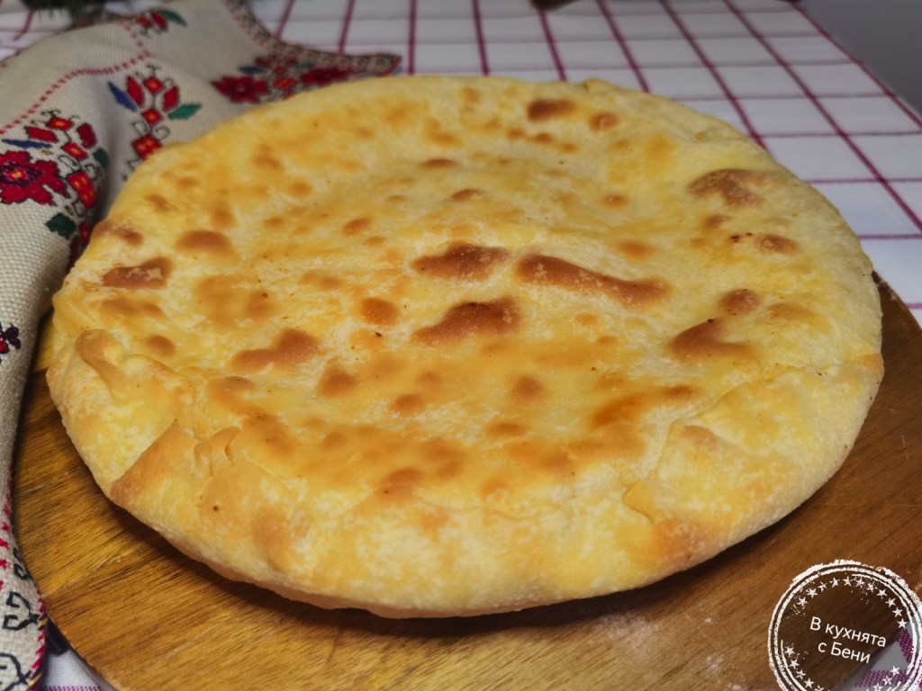 Дъното и стените на тава с диаметър 29 см. намазах с масло. Взех по-голямата топка тесто и я разточих тънко върху набрашнения плот, с размер малко по-голям от диаметъра на тавата. Аз нямам стандартна тънка точилка, а само дебела и използвах и нея, като и внимателно разтеглях кората с ръце. За радост се получи точно както очаквах. По този начин разточих и по-малката топка тесто. Нямам никакъв опит с точенето, но тук то е много лесно и всеки ще се справи. По-голямата кора поставих в тавата, като краищата й трябва да се вдигнат по стените. Разпределих равномерно сместа, загладих я и покрих с по-малката кора. Загърнах я с краищата на по-голямата. Намазах я обилно с половината разтопено масло и сложих да се пече в загрята на 190 градуса фурна, за около 30 минути. Щом доби златист загар, извадих тавата, покрих я с голяма дъска, обърнах я и върнах клин баницата в тавата. Намазах я с по-голямата част от останалото масло и върнах във фурната да се допече за около 15-20 минути.