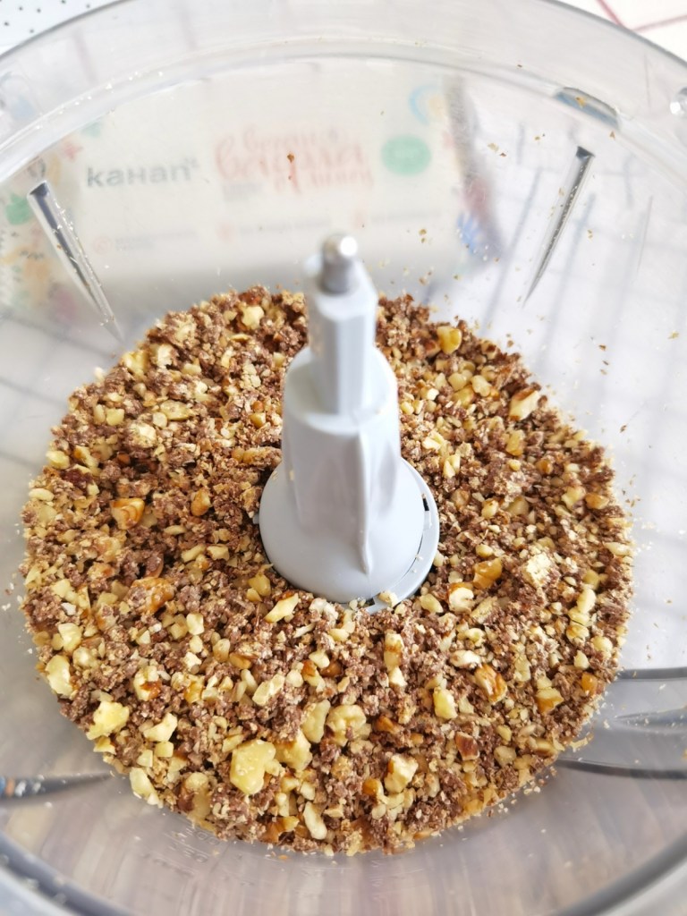 В купата на кухненския робот сложих вафлите и ореховите ядки и ги смлях за кратко до малки парченца. Прибавих ги към белтъците и разбърках внимателно.